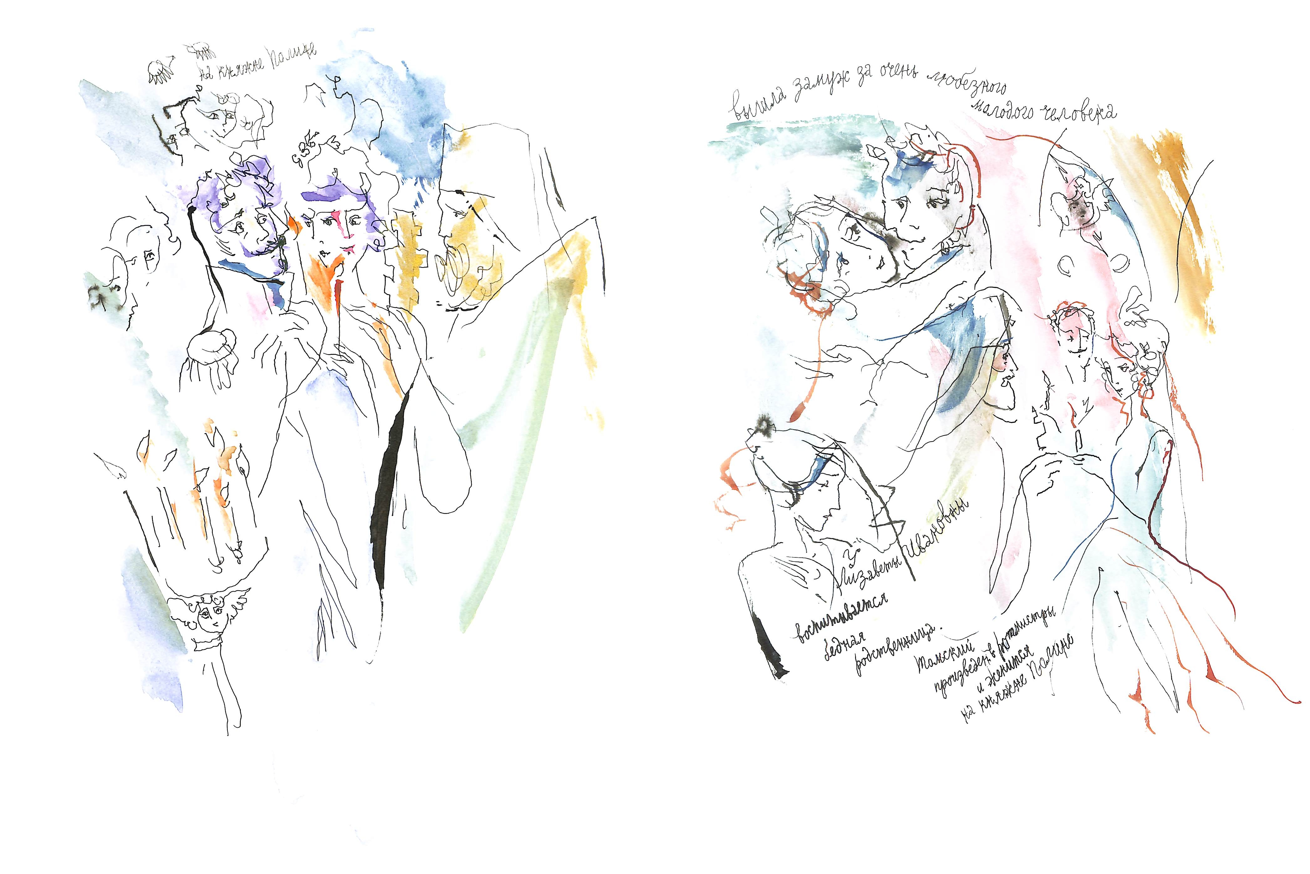 б) Разворот, где на одной стороне герои произведения, а на другой стороне — Пушкин. Было это в первой сцене. Становится понятным, что подобная композиция — не случайность. В каждой сцене будет диалог автора со своими героями.