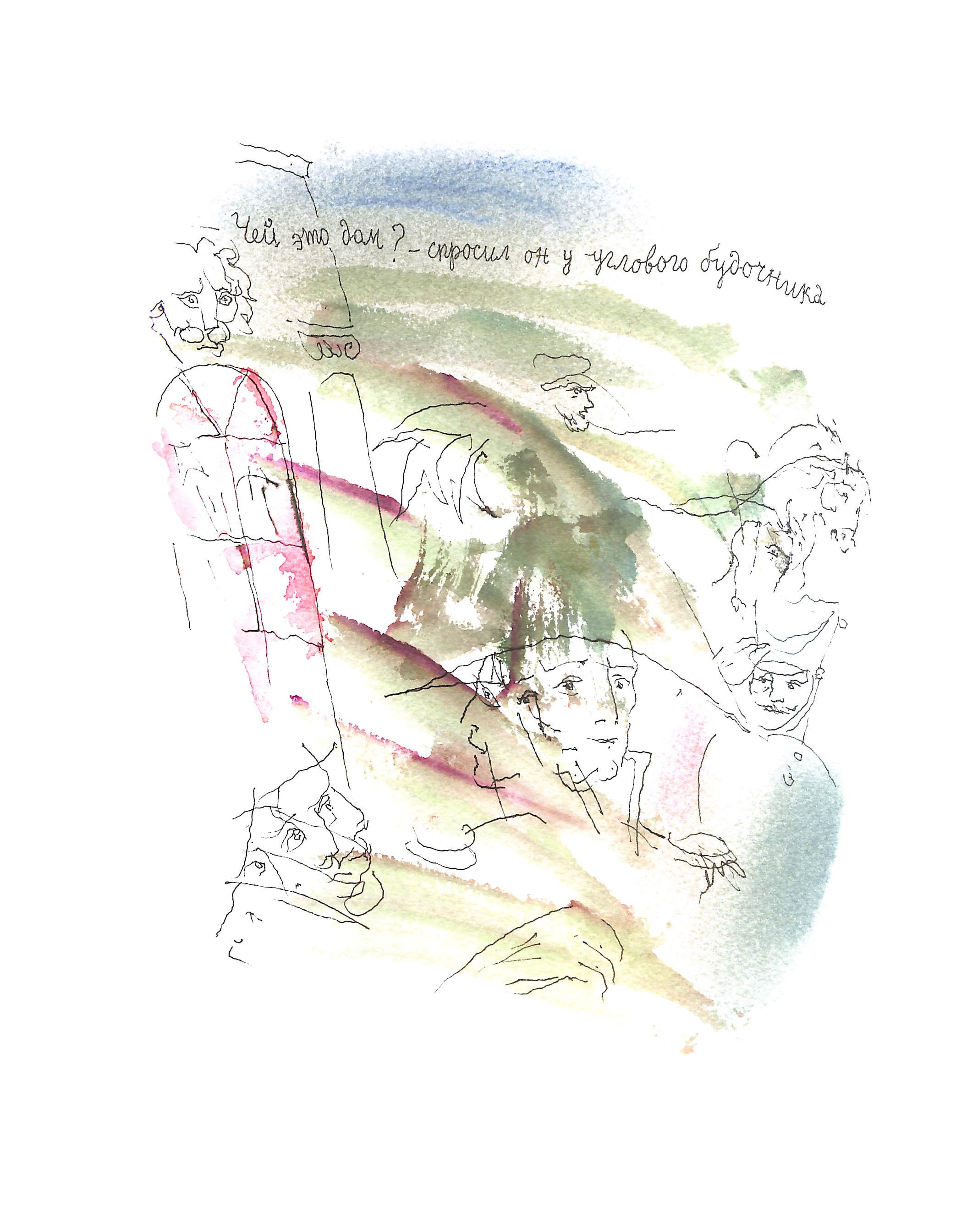 3) Разворот, на котором Пушкин вглядывается в "омрачённый Петроград". А следующий разворот — уже титульный. Мельтешение профилей.