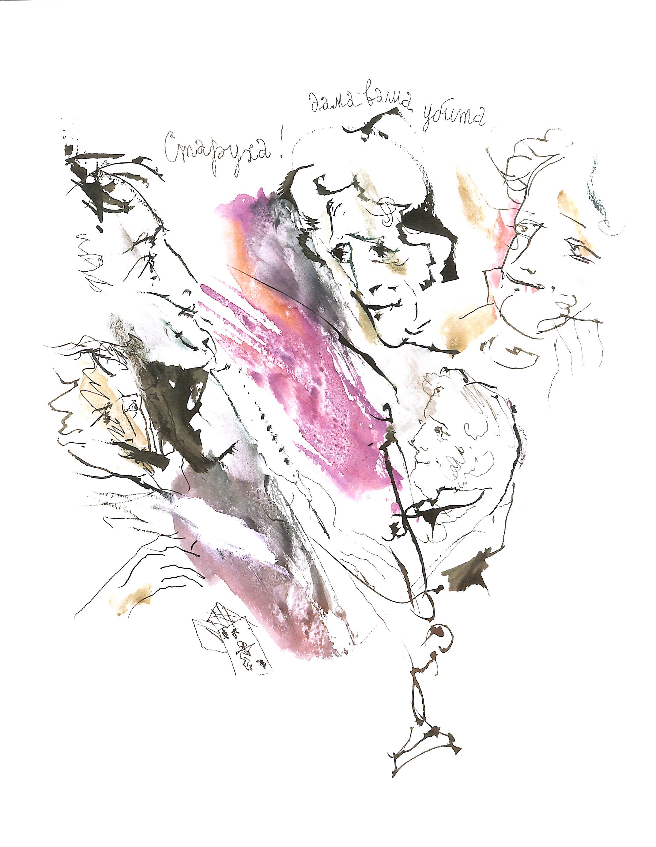 Безрадостная сюита. Цветовая гамма — бледно-грязноватая. В рисунках — полный сумбур: приём, намеренно доведённый до предела. Сюжет "Пиковой дамы" всем известен, можно отдаться впечатлениям. Провокационность Трауготов по-прежнему взбадривает пушкинистов.