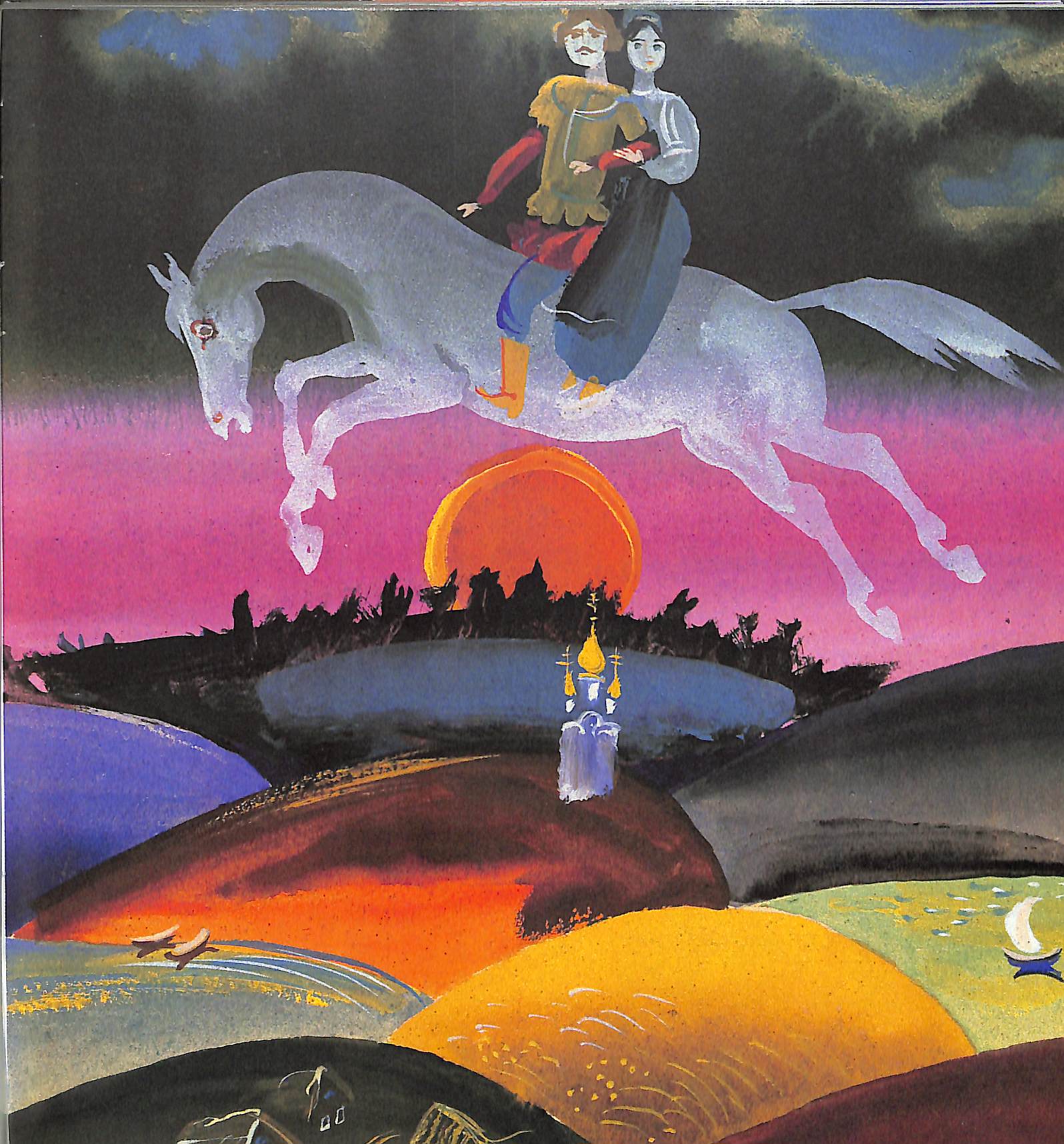 2) Есть в этой сюите и сюжетные картинки. На закате парит одна из сестёр на муже-вороне, а Иван-царевич с Марьей Моревной парят на волшебном коне.