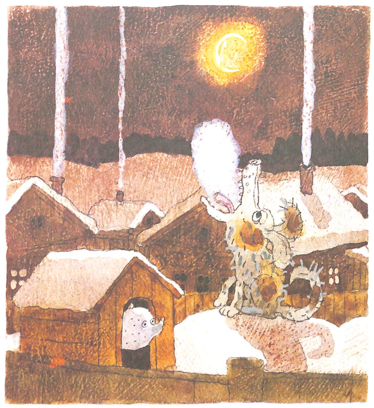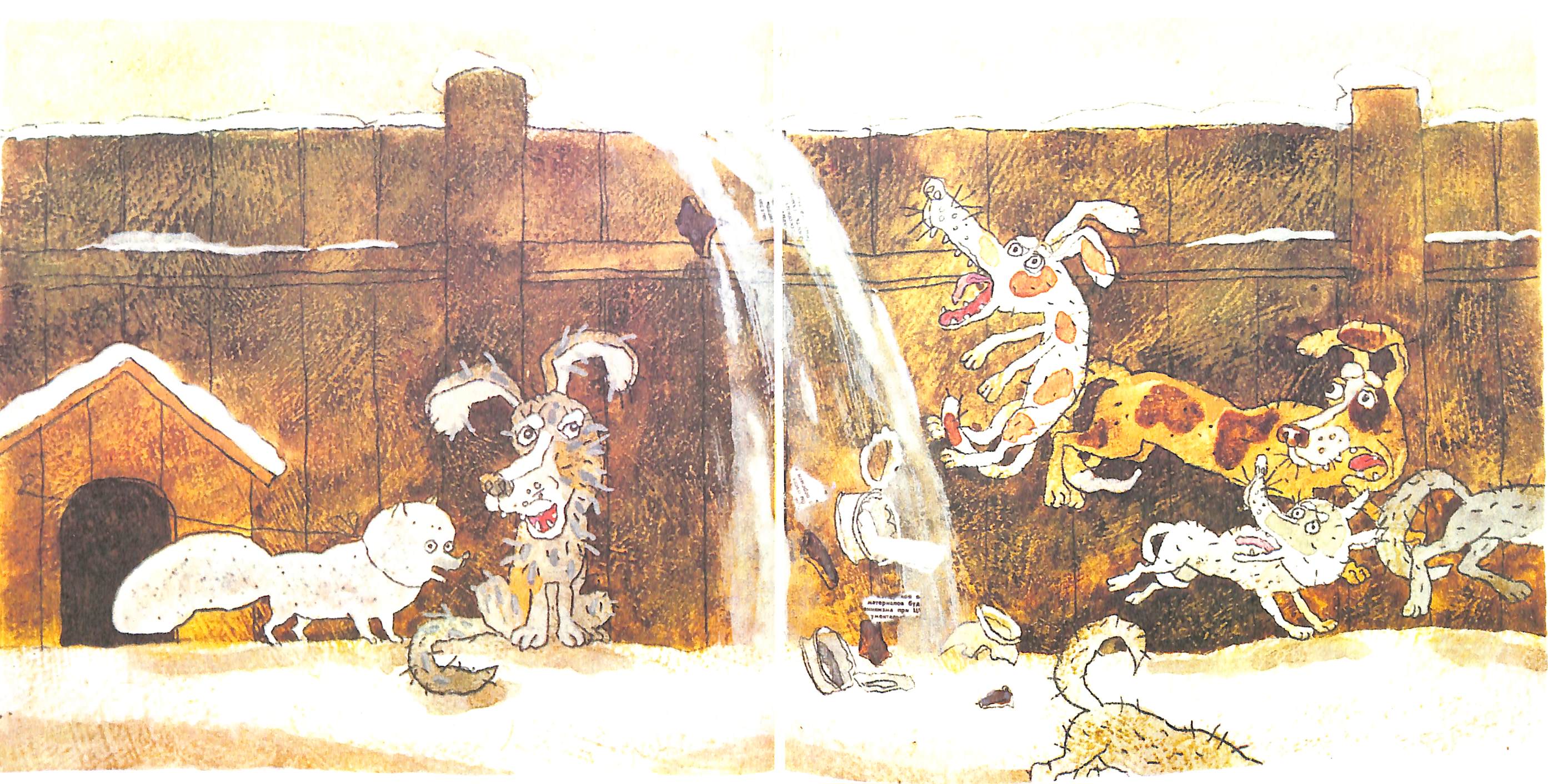 Художник добрался до любимой сцены (которую ни Калиновский, ни Капустина не отразили). Собачья драка — у Трубина подготовка к драке. Недопёсок с перчаткой вышел к жилью.
