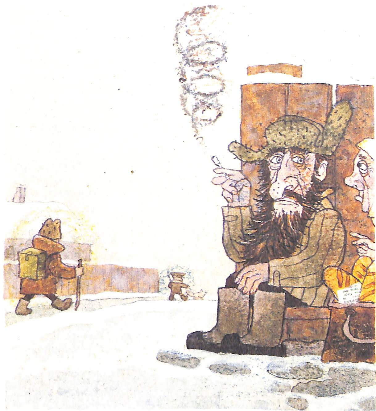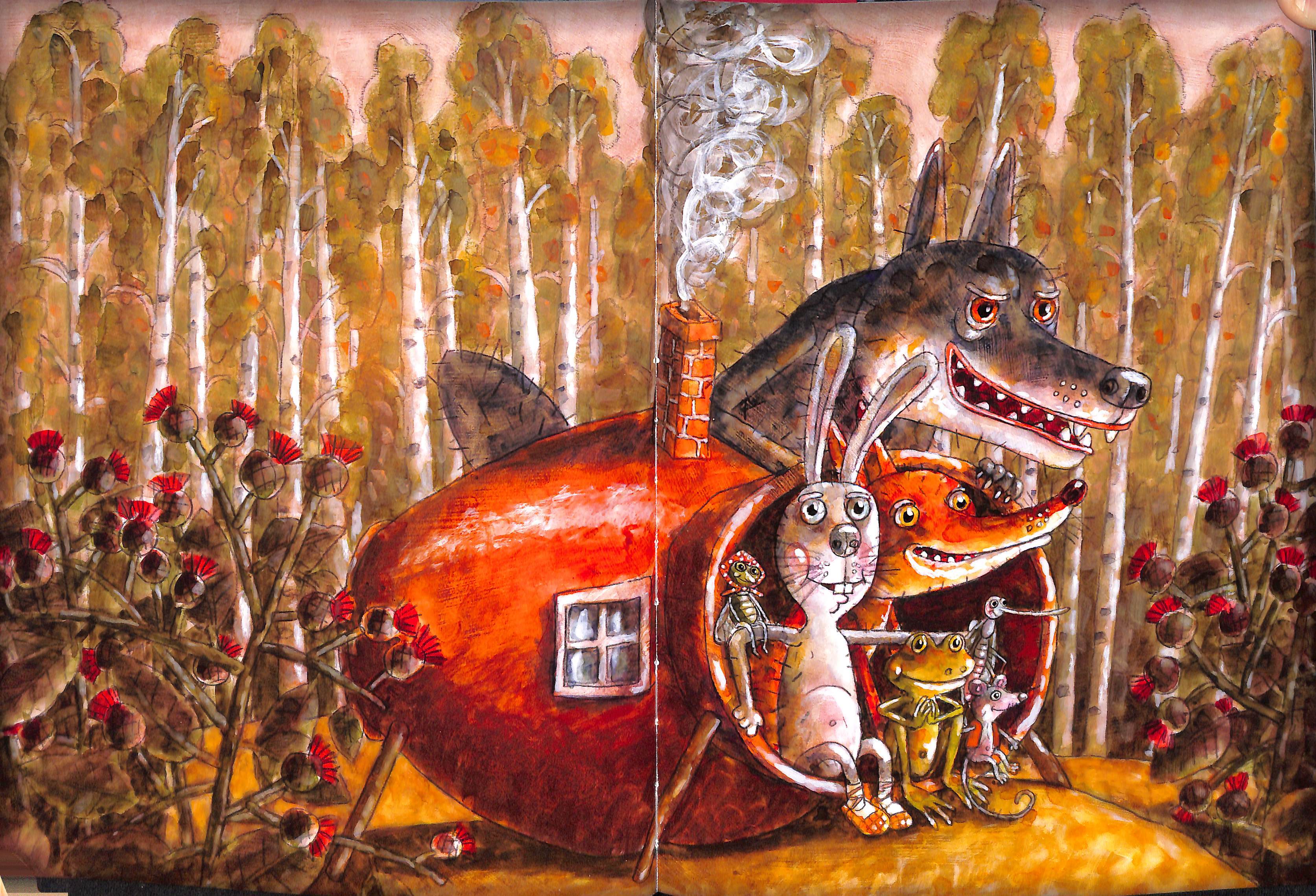 Сказка "Теремок" про дружных зверей — мирное сожительство волка и лисицы с зайцем. Вот медведь там плохой. Ну художник медведя и не рисует. Хотя кого Трубин хочет обмануть? Гибель Теремка и его обитателей неизбежна. Медведь беспощаден.