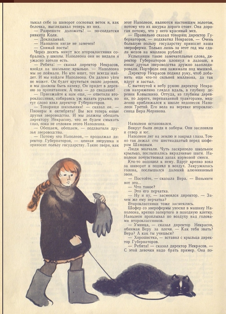 2) Капустина в первой журнальной публикации производственными отношениями не заинтересовалась. Нарисовала сценку, как директор Некрасов в полуботинках по снегу за следам песца бегал.