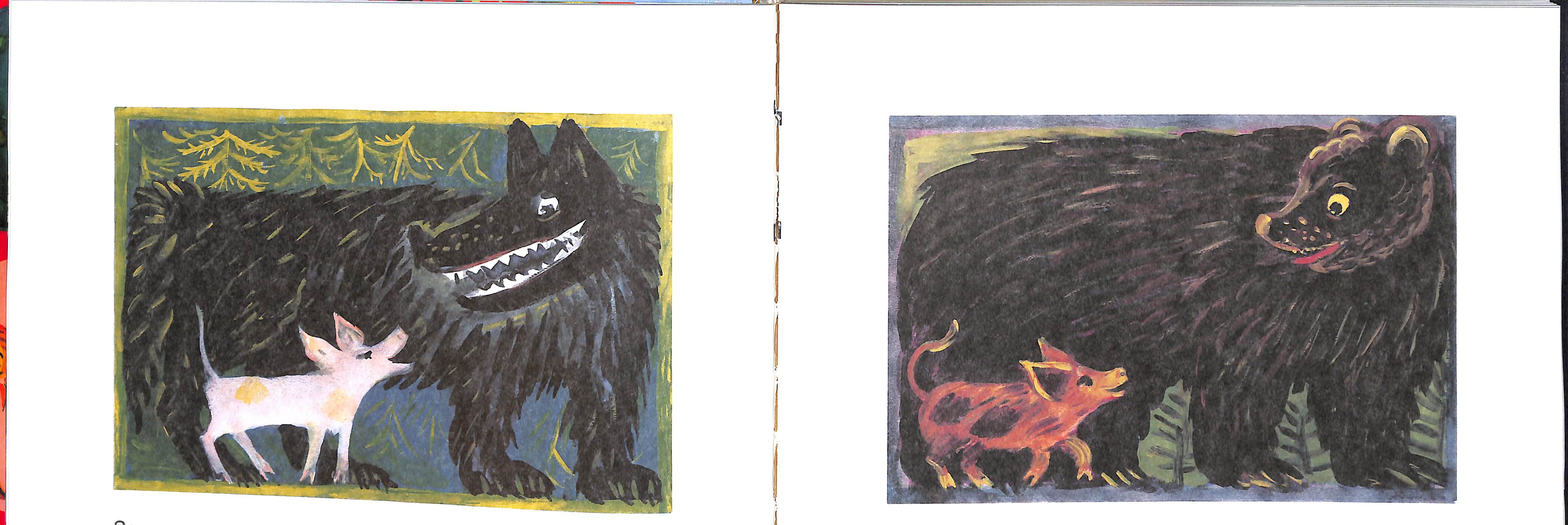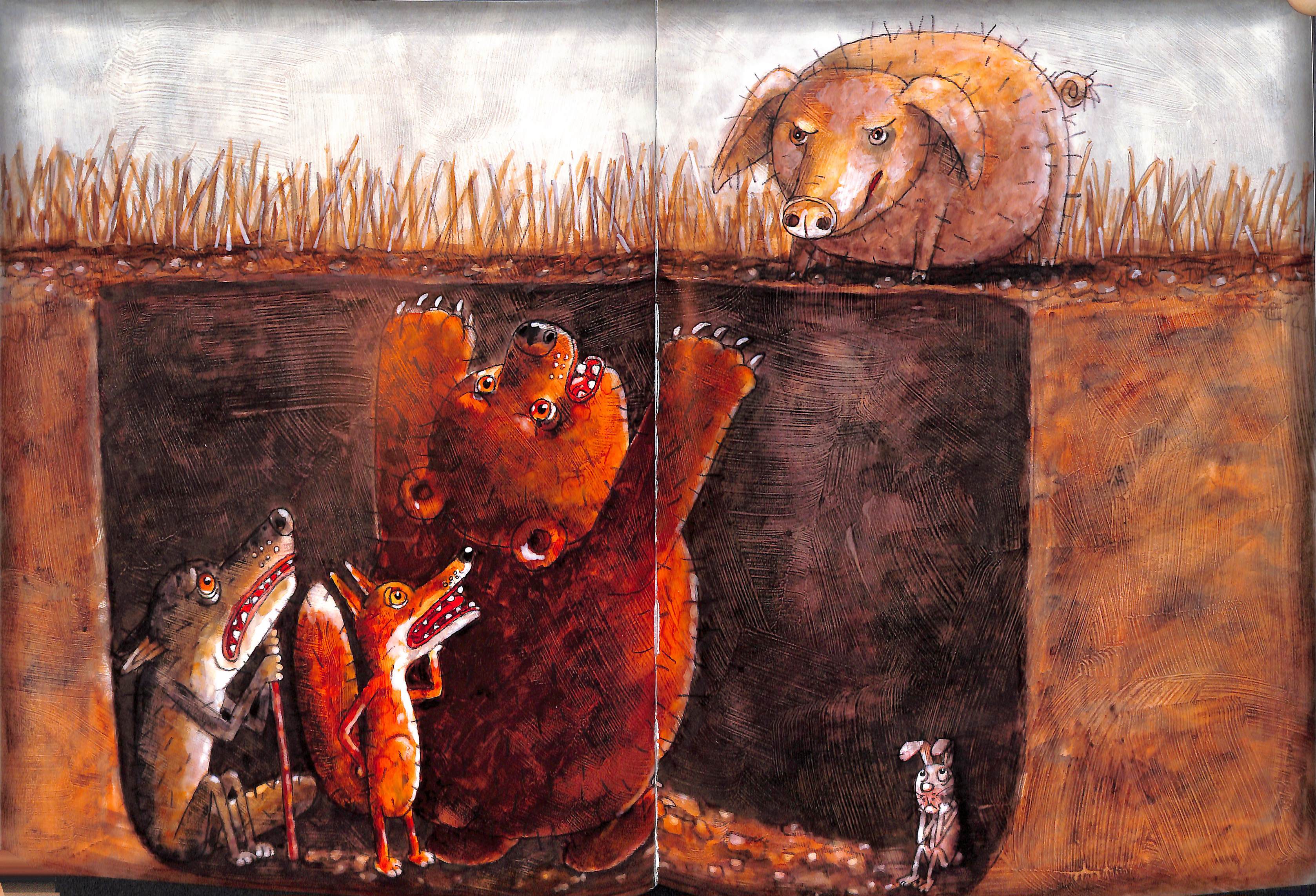 2) По пути ему встречались разные дикие звери. Почему-то встретившиеся волк и медведь просили борова взять их с собой. Наверное, это была хитрость, шитая белыми нитками. Полякова рисует трогательного маленького свина рядом с кровожадными хищником и падальщиком. Но не так-то прост наш боров. Он вёл громадных зверей через яму, которую сам легко перепрыгивал, а неуклюжие (так надо) волк и медведь в эту яму падали.