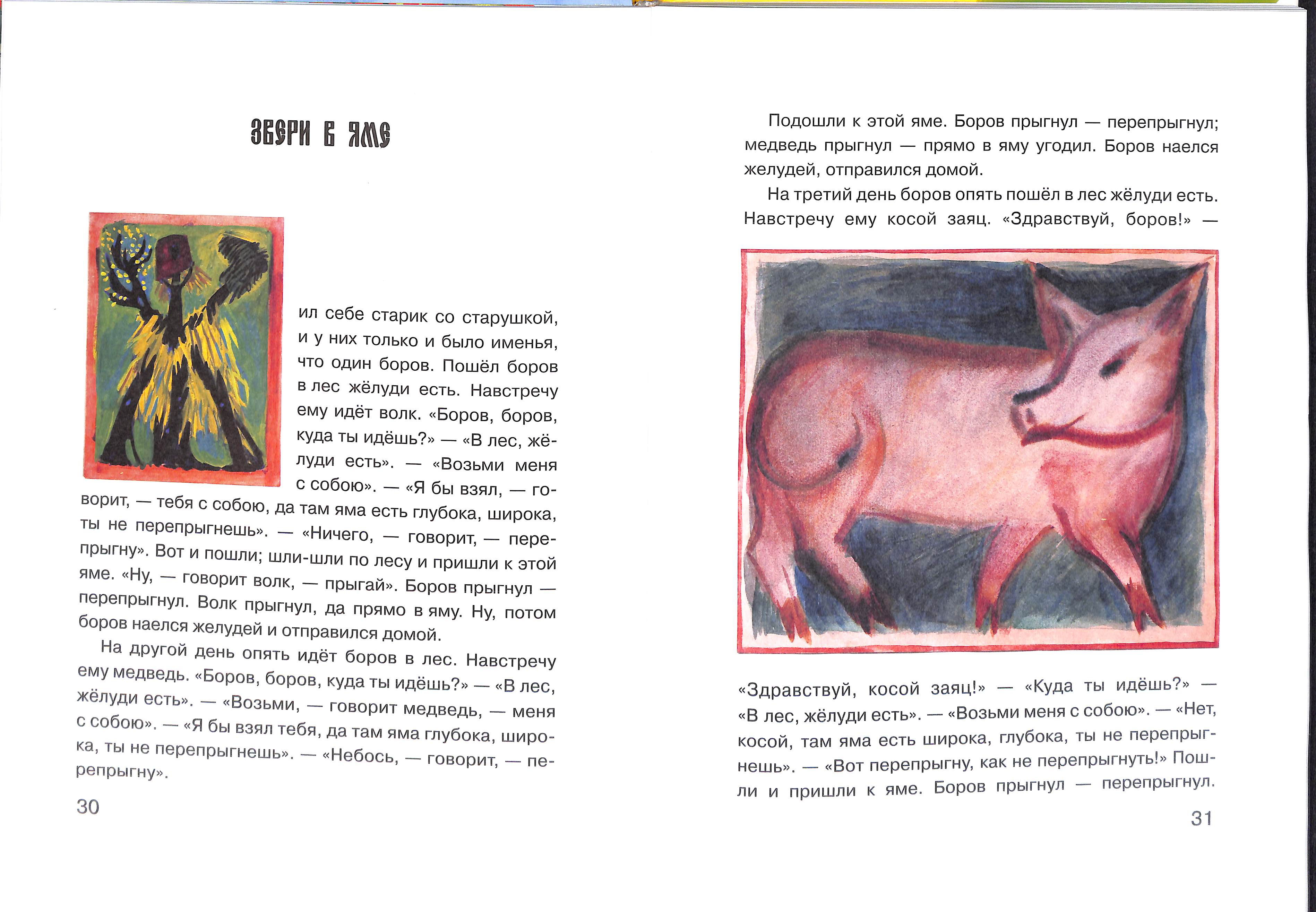 Есть разные версии сказки "Звери в яме", Полякова иллюстрировала вариант сказки с боровом. Трубин, как видно на его иллюстрации, тоже иллюстрировал вариант с боровом. Но в его книге текст другого варианта сказки — бывает... Текст ничто — злобный боров важен, где ещё его увидишь?