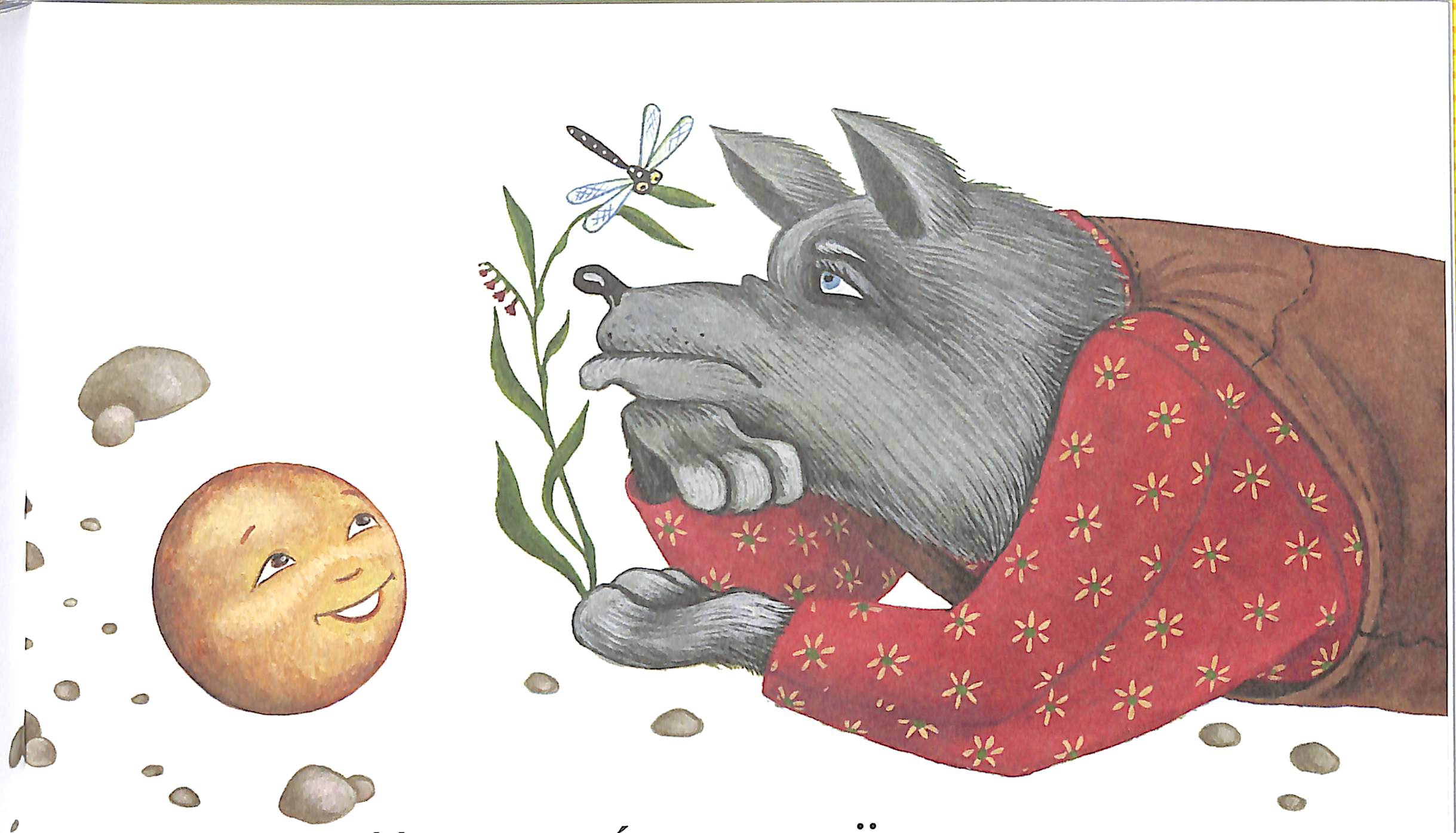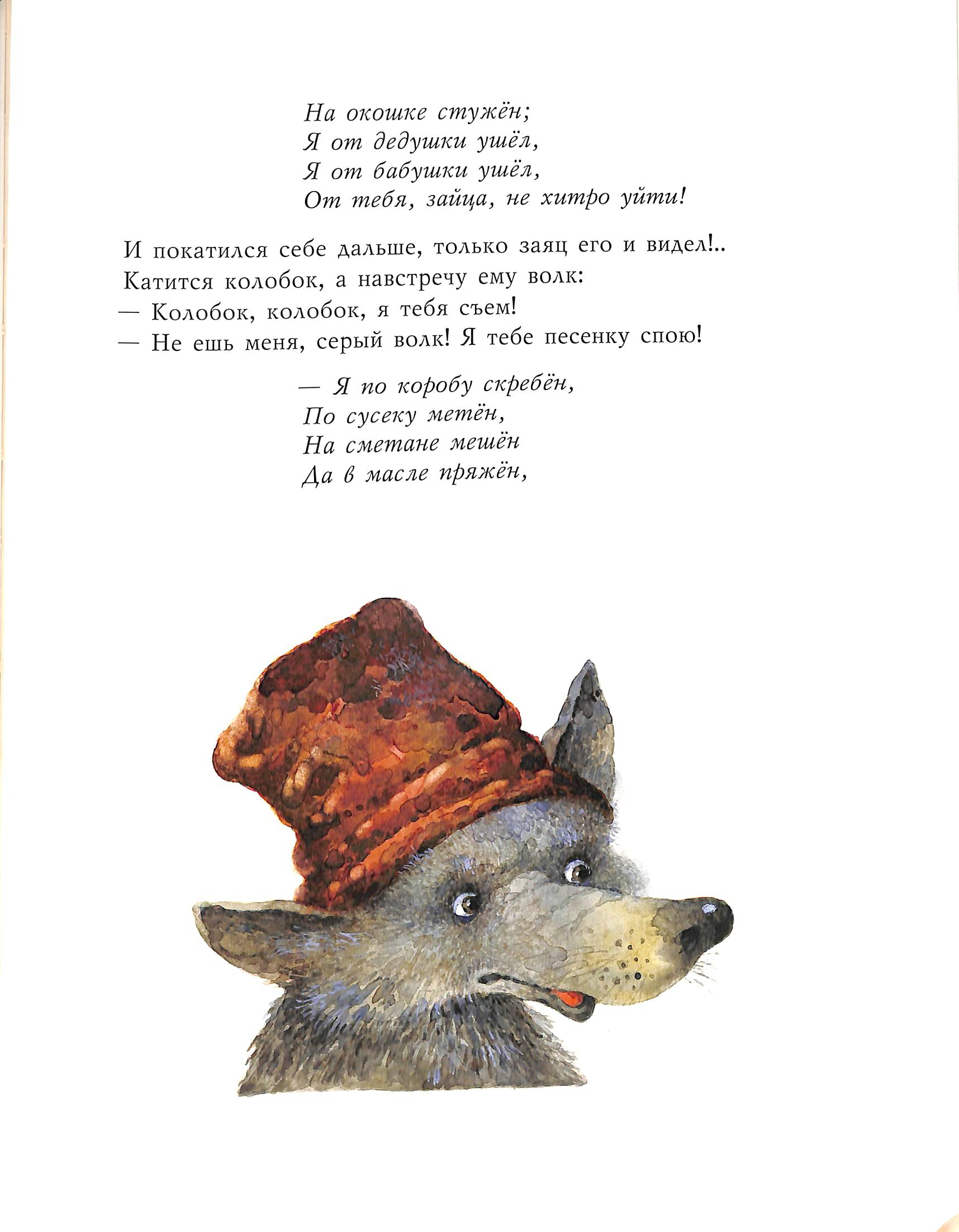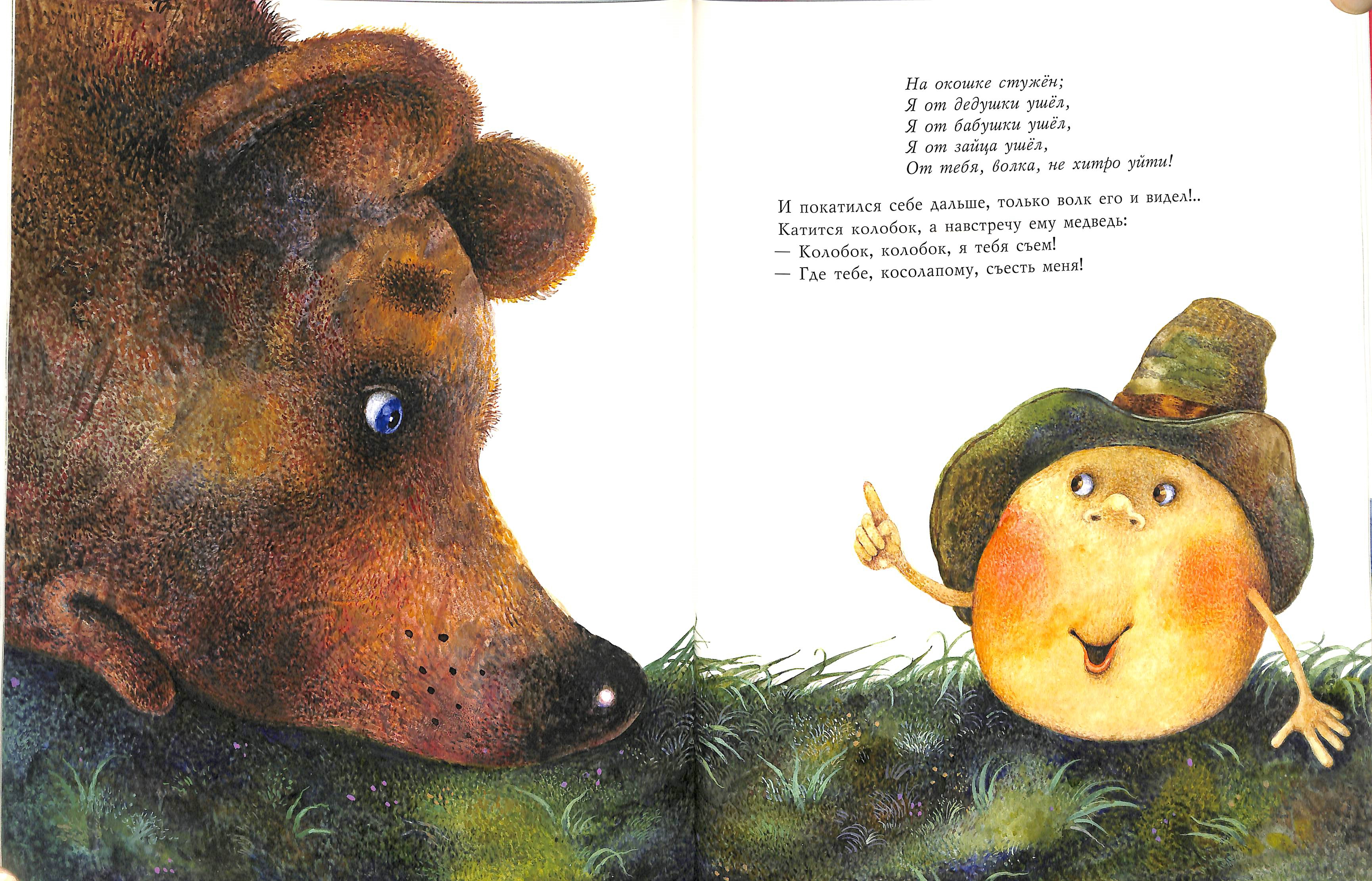 Уже нет никого пошагового сопровождения текста. Заяц вообще не интересен (его на обложке можно посмотреть), волк даётся отстранённо, без Колобка: просто жанровая зарисовка — волк в крестьянской шляпе. Развёрнутый сюжетный рисунок — для встречи Колобка с медведем. Ракурс необычен: всё внимание — на Колобка-пижона, а от медведя в кадр только голова влезла.