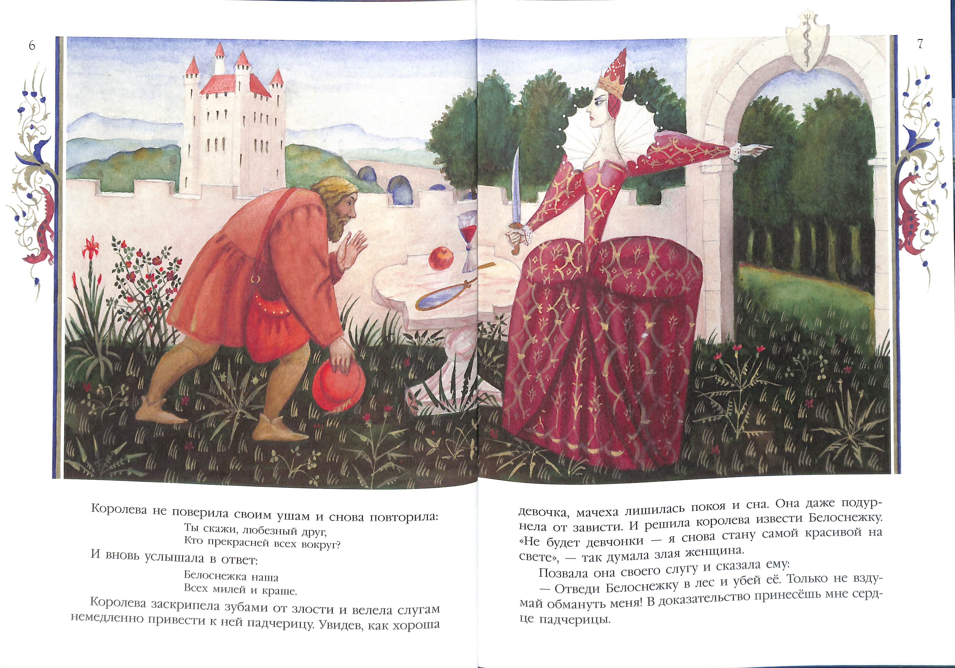 Как мы уже могли убедиться, характер охотника, которому поручено извести Белоснежку, очень интересует иллюстраторов. Фëдоров трактует этого персонажа как слабовольного тюфяка, которого легко любой уломает — потому он и поддался на мольбы Белоснежки. Такой образ — он больше из поздней живописи Брейгеля. Вот королева-мачеха — вся из прямолинейной средневековой книжной миниатюры: острая, неэмоциональная, и с ножом в руке. Фёдоров себе такое смешение может позволить: он стилизатор, а не имитатор.