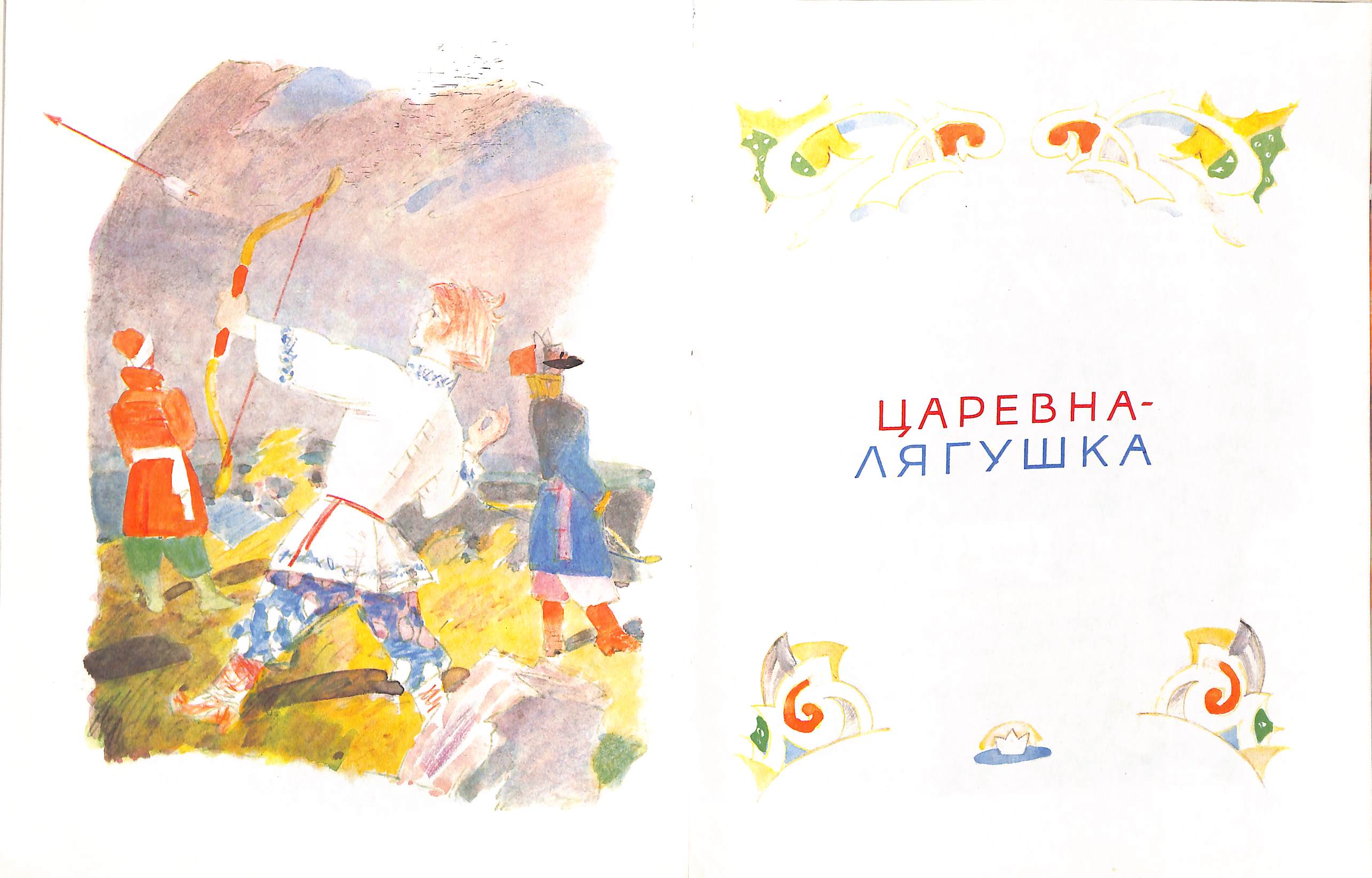 На шмуцтитуле — традиционная сцена стрельбы в разные стороны, но на заставке — необычная композиция. Три брата-царевича мирно сидят за столом. Из сказки складывается впечатление об антагонизме братьев (но это, скорее, из-за конкуренции их жён). Коровин рисует холостяцкую идиллию братьев.