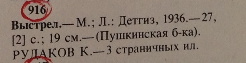 Тонкая книжка в мягкой обложке. Предюбилейный 1936 год. "Детгиз" издаёт массовую серию иллюстрированных книжек. Художник "Выстрела" — знаменитый К.Рудаков.
