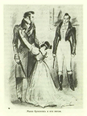 Было две иллюстрации: заставка с метелью (которую воспроизводили потом) и жанровая концовка, когда Бурмин пал на колени перед Машей.