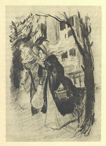 Вырин поехал за дочерью в Петербург. Добужинский не отказывает себе в удовольствии рисовать город и маленького человека на его фоне.