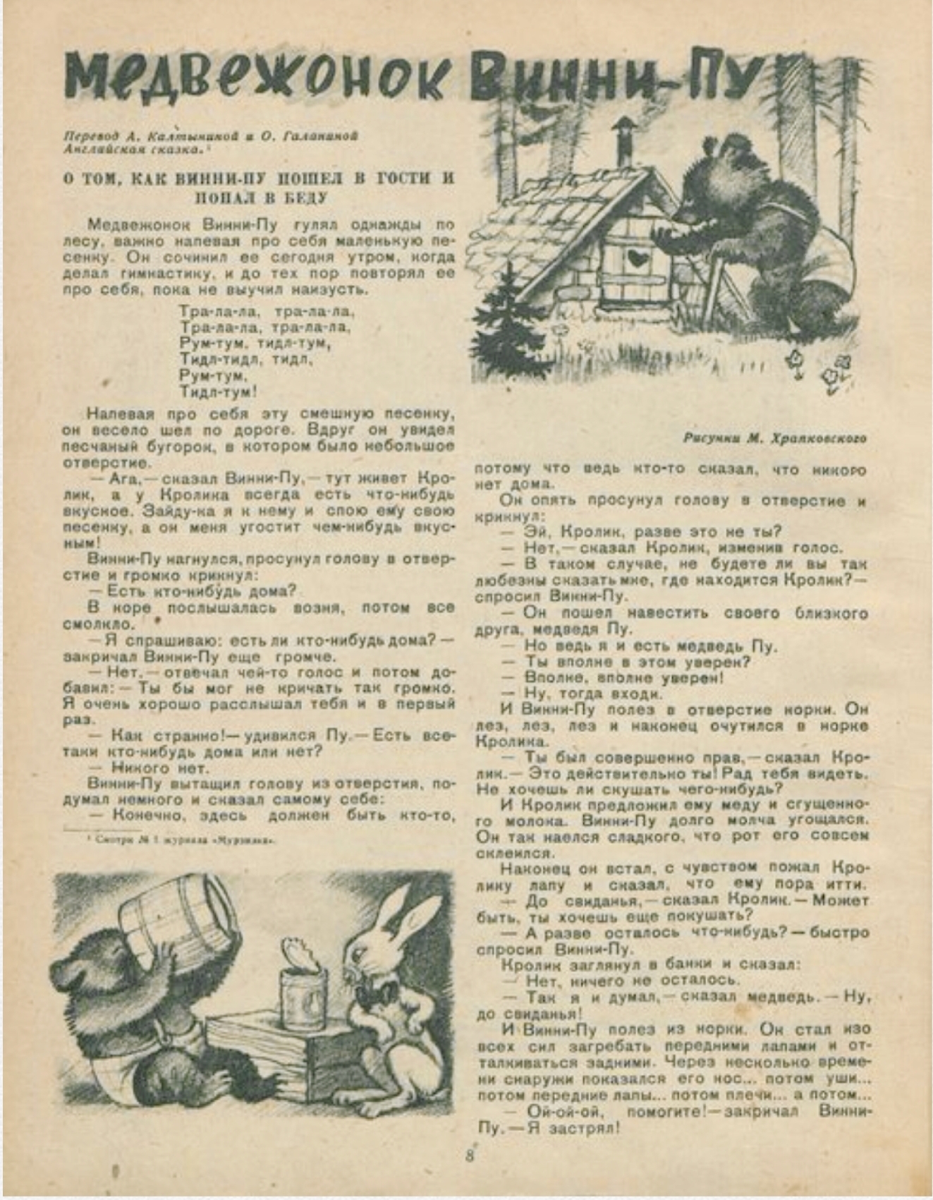 Художников назначили на эти публикации известных. В первом номере Винни-Пуха рисовал А.Лаптев, а в девятом — М.Храпковский. Продолжения работы малоизвестных советских переводчиков не последовало. А то, как знать, может, Лаптев нам перед войной создал бы канон "Винни-Пуха" (как создал канон "Незнайки").