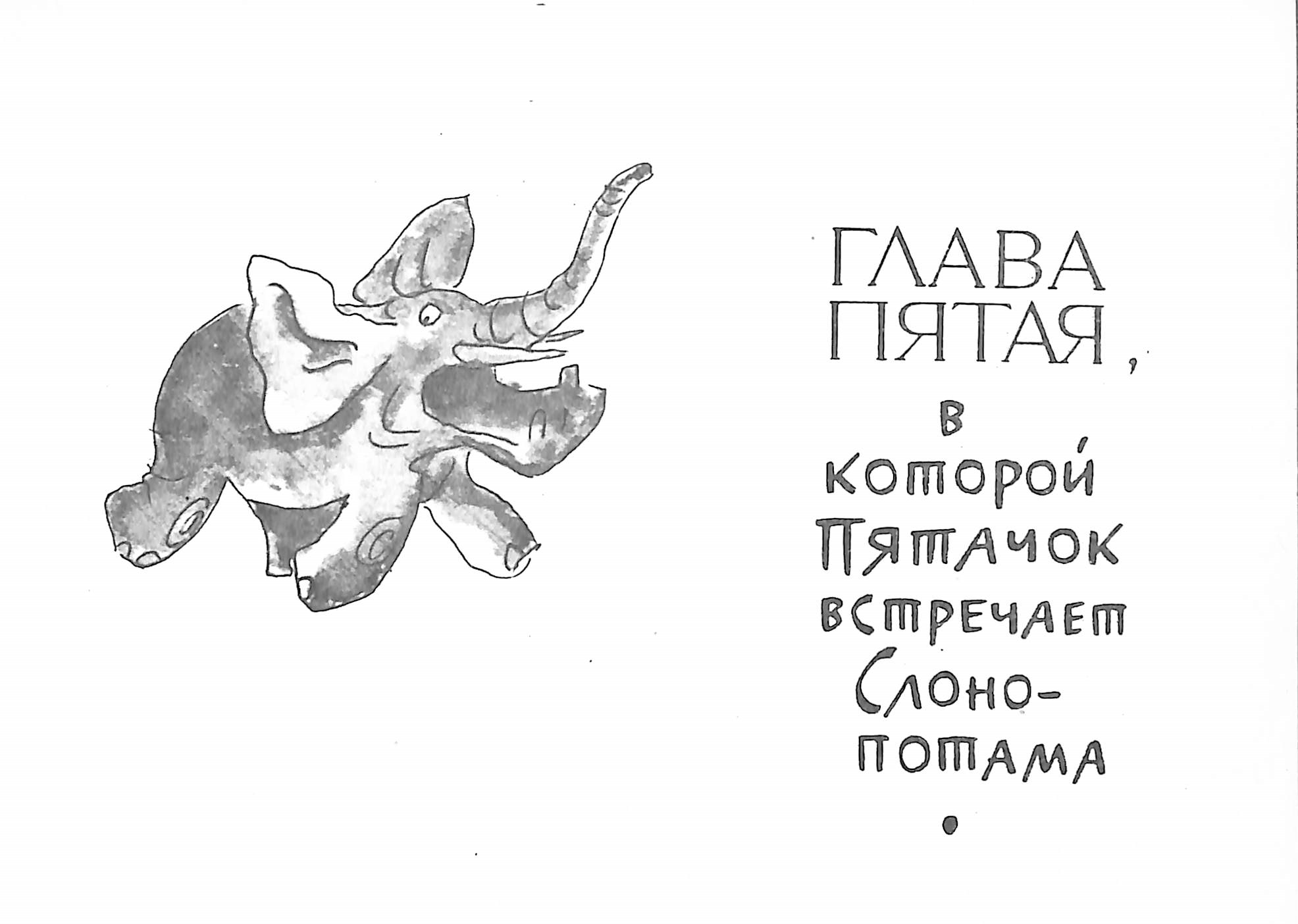 А в пятой главе побольше действия. Пух решил поймать Слонопотама. Пятачок вырыл яму, а Пух принёс приманку — мёд. Ночью Пух забрался в яму-ловушку и засунул голову в горшок (вылизывал остатки мёда). Утром Пятачок увидел в яме ужасного Слонопотама с горшком на голове. Когда всё разъяснилось, Пятачок жутко сконфузился.