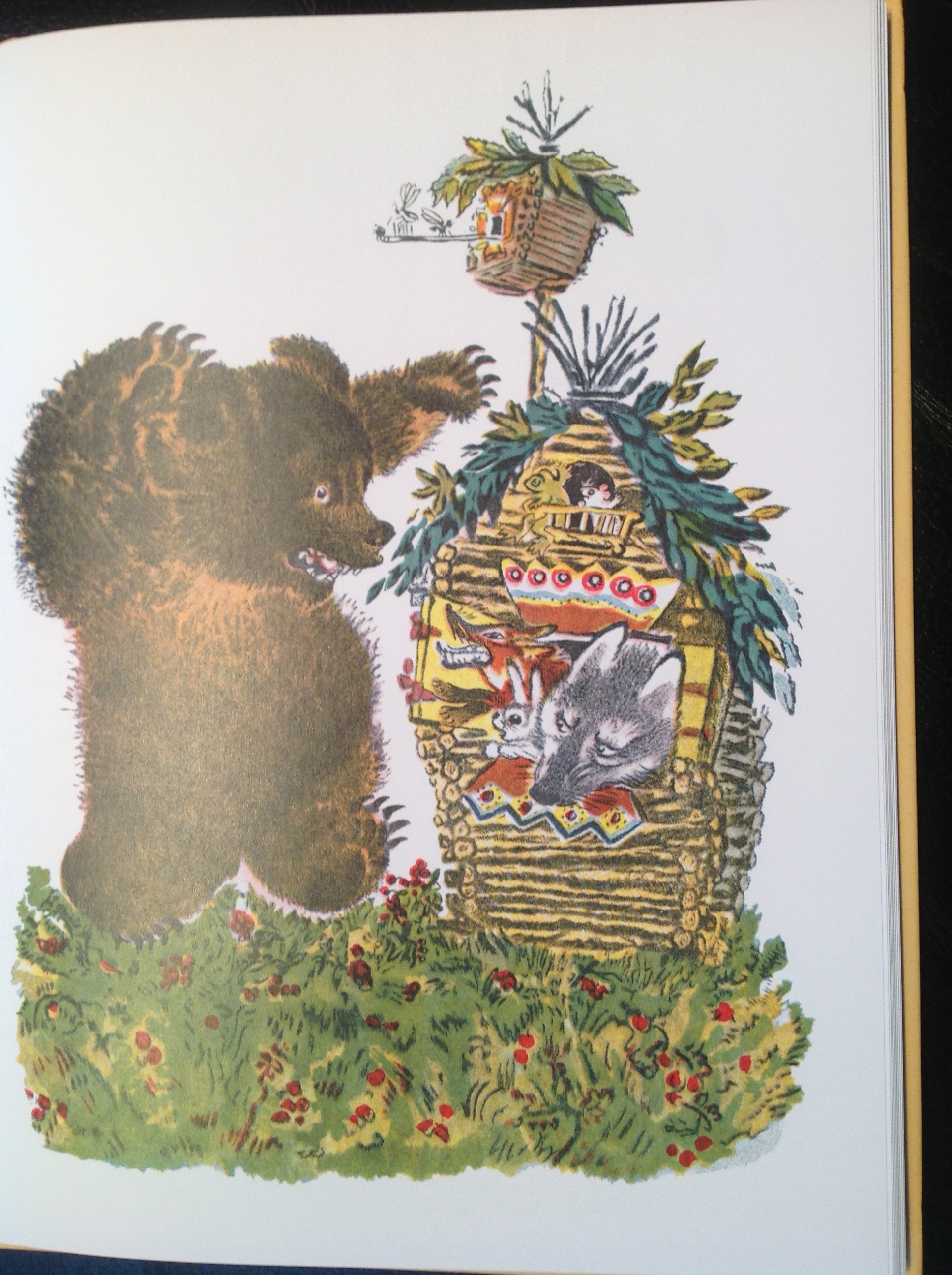 В книжке про Чарушина есть подлинники (ещё не отретушированные) обложки для отдельного издания "Теремка" и вариант прибытия Медведя (он здесь максимально пупсовый). Даю фото этих картинок.