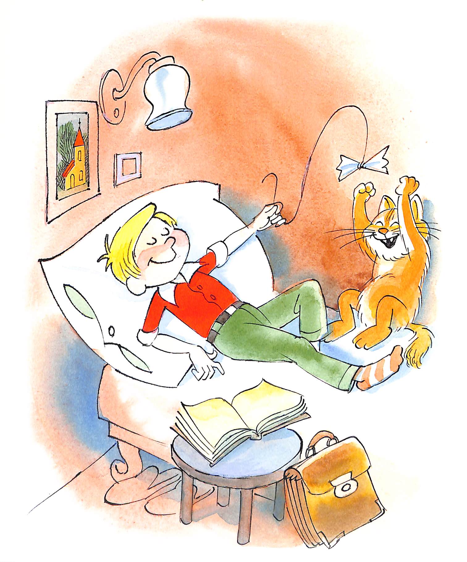 а) Очень непросто нарисовать двоечника и тунеядца. С одной стороны, этот ребёнок свободный, а с другой — постоянно находится под прессингом окружающих. Чижиков рисует беззаботного мальчишку и подавленного старика. Это один и тот же человек, но беззаботный — дома, а удручённый — в школе. Кстати, образ потешного старичка в коротких штанишках из первого цикла иллюстраций Чижиков не воспроизвёл — чем не уступка общему мрачному колориту сказки?