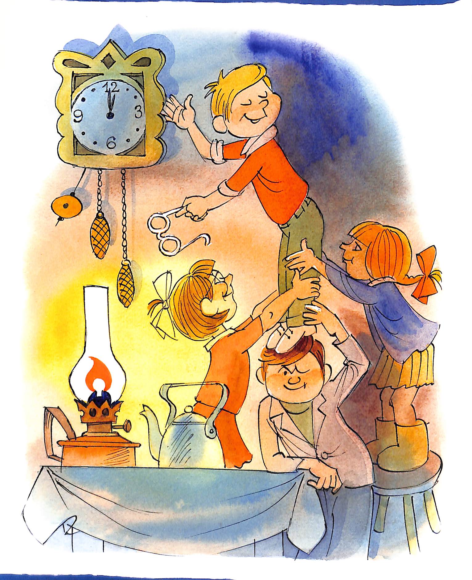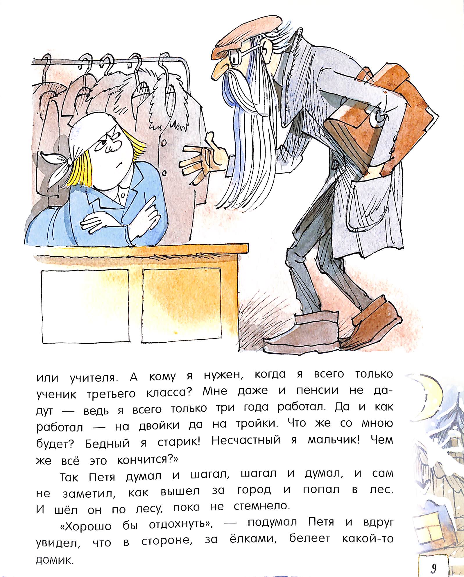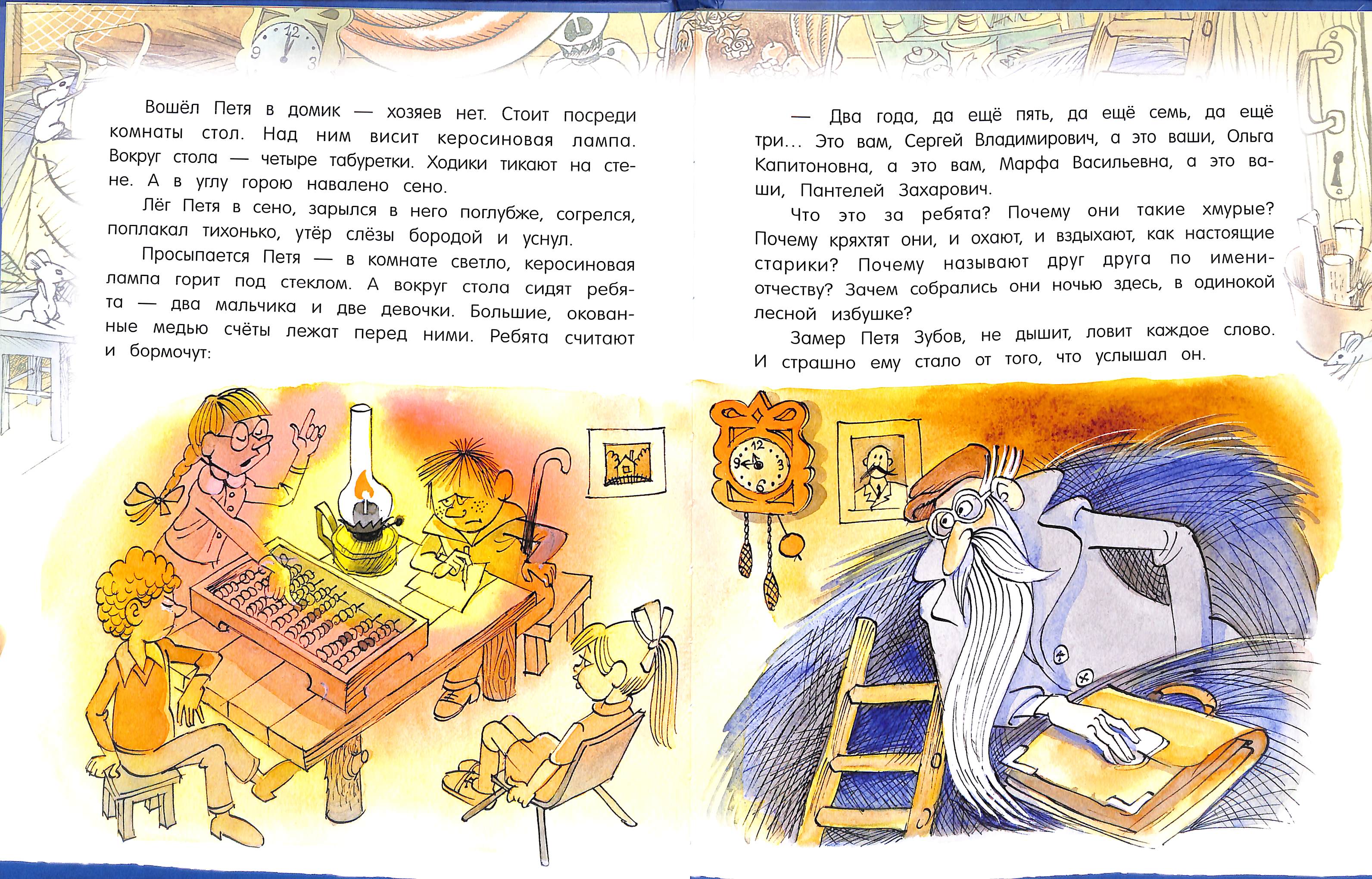 б) Старик-третьеклассник Петя подслушивает в лесном домишке, как вернуть обратно детский облик. На картинке — злые старики-волшебники, превратившиеся в детей. Дети как дети, хотя у того, кто стоит около часов, недетская сутулость. Это вообще одно из самых интересных ожиданий: как художник покажет, что у волшебников только оболочка детская, а на самом деле они — злобные старики. Интересное решение нашла Петрова.