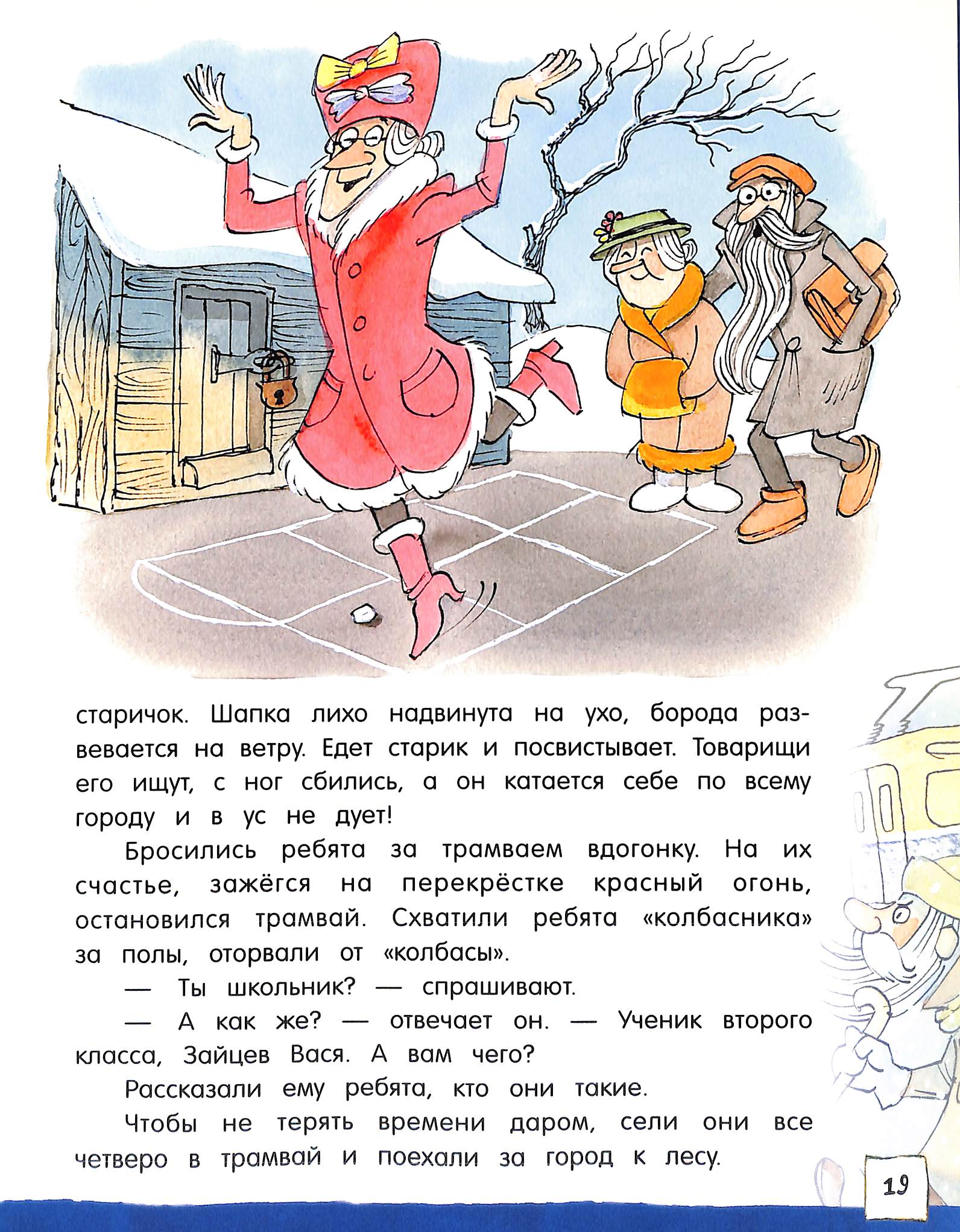 б) Петя собирает других заколдованных в стариков детей — узнаёт их по детским замашкам. Всё художники любят вот этот эпизод: старушка скачет в классики. Сюрприз в тексте: последнего старичка, как известно, снимают с трамвайной "колбасы". В журнальном варианте неизвестные подробности: старичок так просто не сдался, а удрал: он думал, что его ловит "комиссия по борьбе с колбасниками".