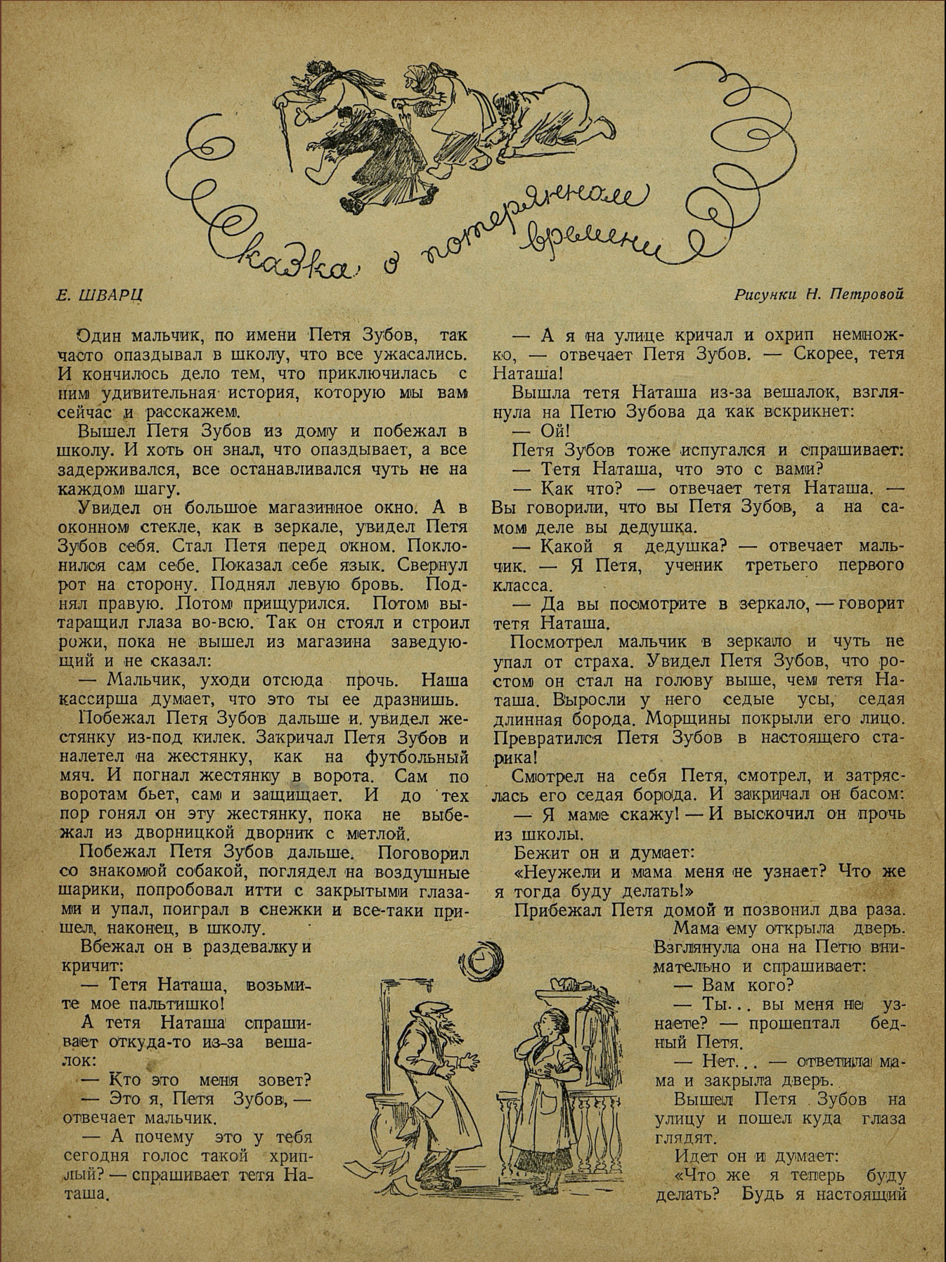 "Сказка о потерянном времени" была опубликована в предвоенном 1940-м году в ленинградском журнале "Костёр" (№ 7-8). Первоначальная редакция текста была другая, концовка отличалась существенно. Иллюстратором журнального варианта значилась художница Н.Петрова. Она же проиллюстрировала ленинградский сборник Шварца 1960 г. и 1969 г. Так что посмотрим первые иллюстрации с последующими вариантами.