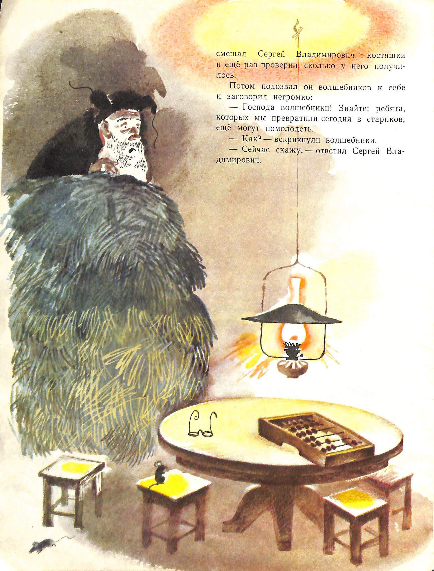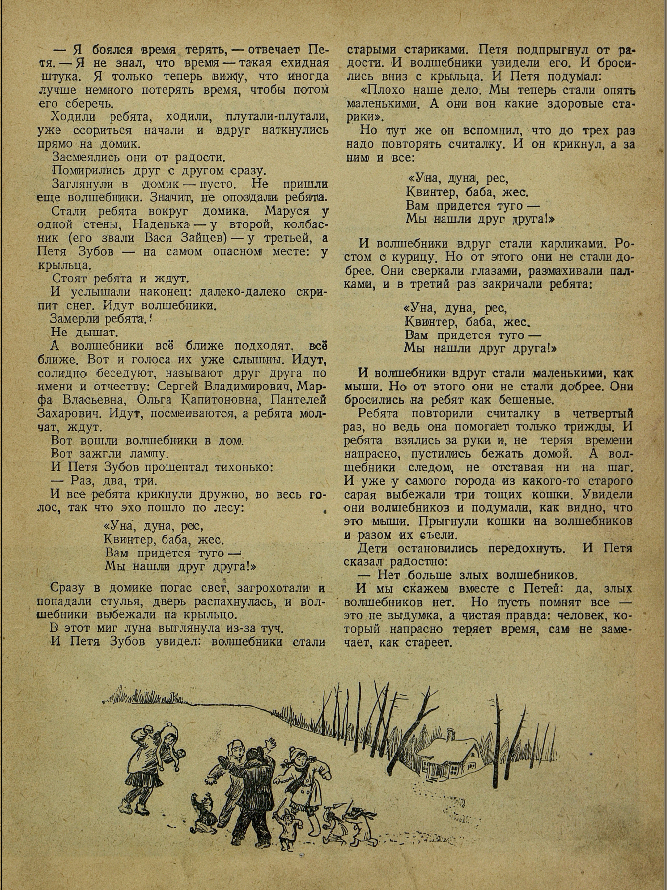 д) Переработанная концовка, всем известная: заколдованные дети крутят назад стрелки часов, постепенно возвращаются к своему детскому облику, а волшебники в это же время превращаются обратно в стариков и в конце исчезают без следа. На картинке показаны колдуны-старики: многослойные одеяния, старорежимные бороды... Их одеяния резко отличаются от ватных пальто простых советских стариков. Колдунам лет по 80, родились они в этой книжке в 1880-м году (в журнале родились в 1860-м году). Благодаря одежде увидел явное противостояние поколений. Причём, противостояние молодой советской поросли недобитым "бывшим". Интересно, что в рисунках 1940-го года это противостояние не было подчёркнуто. Возможно, при первой публикации такого прочтения и не предполагалось: размежевание в довоенную советскую эпоху было классовым, а не поколенческим.