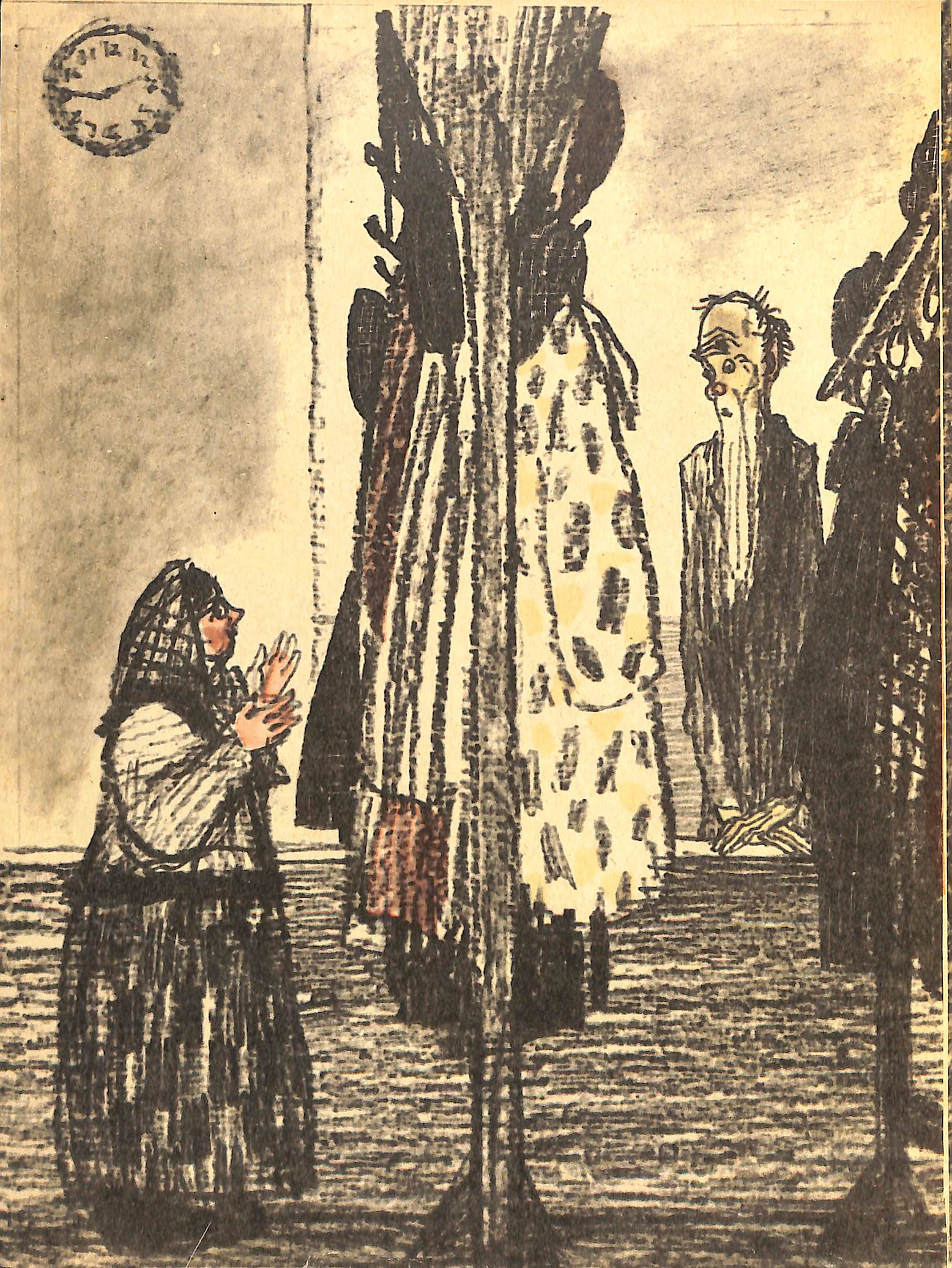 а) Художница пытается одеждой показать, что старик — это мальчик: школьная фуражка, короткое пальтишко. Сейчас на это мог бы указать и шарф, завязанный узлом сзади, но, как видно по другим картинкам, и в 1940-м, и в 1960-м это могло быть чертой взрослого облика (шарфы не для красоты носили).