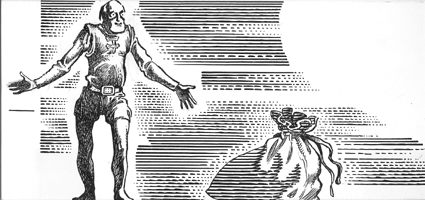 К каждой пьесе по одной иллюстрации. К "Скупому рыцарю" вот такая: барон над златом стоит. Очень живая мимика у барона получилась. Явно оригинальная трактовка художника.