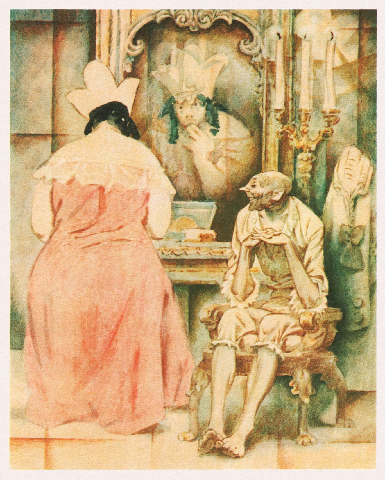 2) Абсолютно бытовая сцена. Судя по всему, это Настасья — мать Танюшки — застигнутая алчными купцами, убеждающими продать им шкатулку. Синяя ящерица внизу справа.