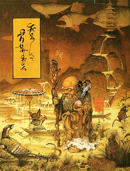 На титульном развороте — все японские сказочные символы: чёрт, лиса и дракон. Теперь уж точно тенденция! Повторяется также ситуация, когда на внутренних иллюстрациях дракон не встречается.
