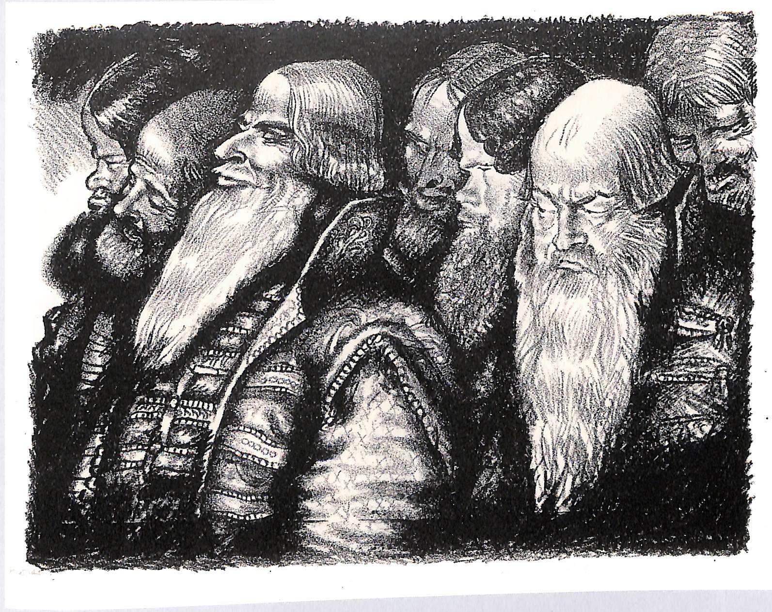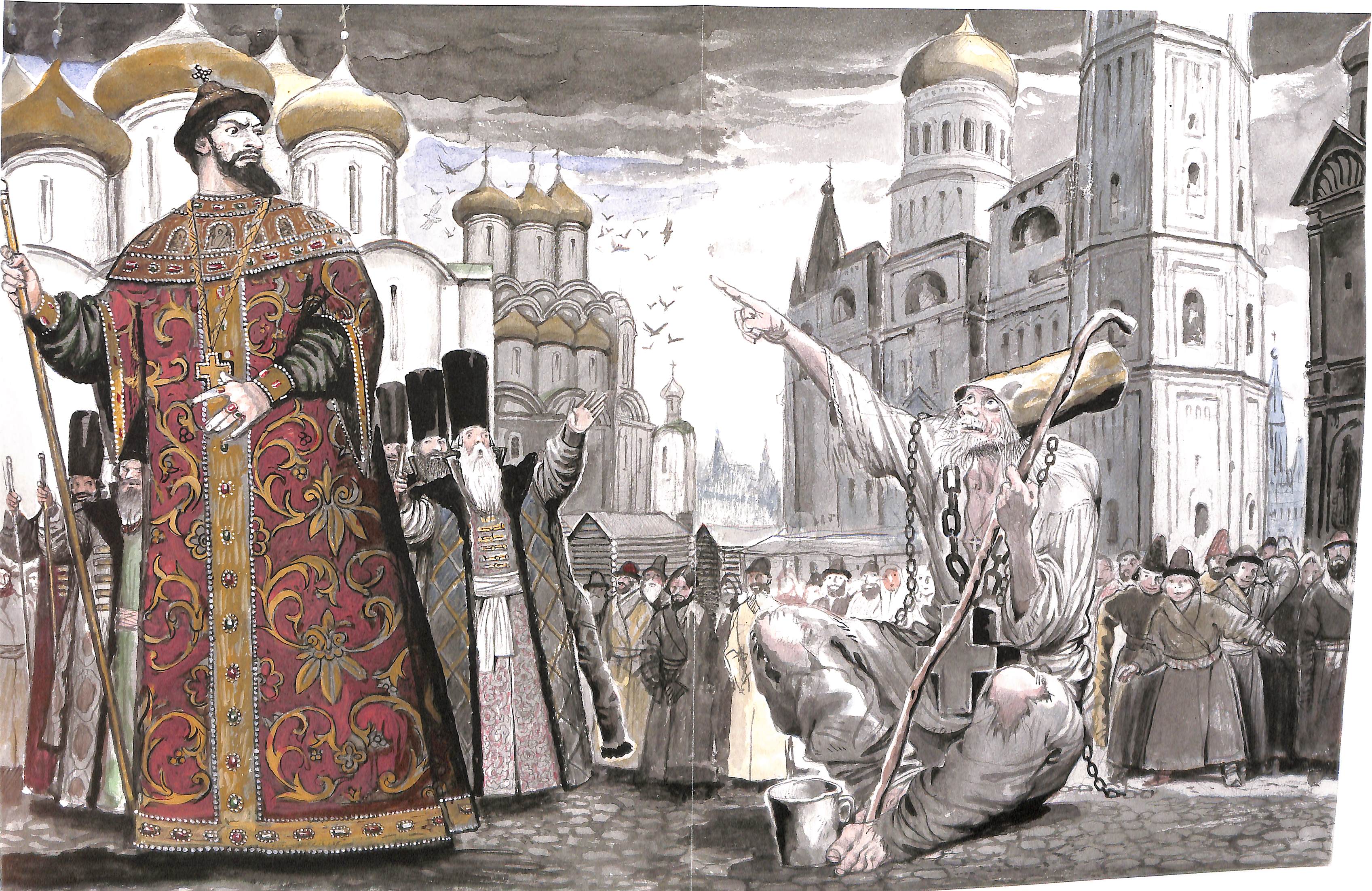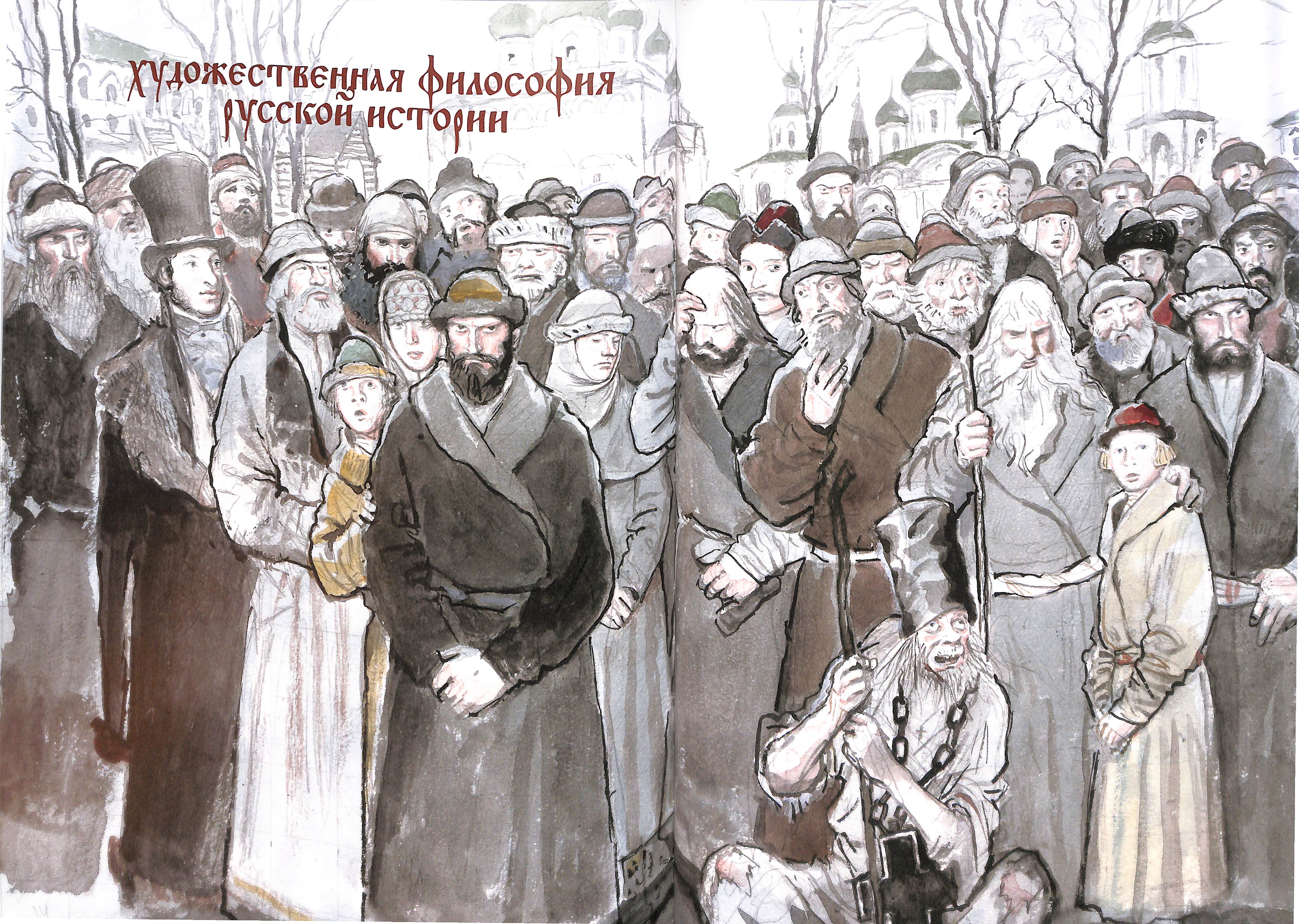 Юродивый, хоть и обличитель, но всё же не важный прокурор, как у многих иллюстраторов. Есть тут следы окарикатуренности персонажей из юношеской сюиты, но веришь, что Николка-то, действительно, был таким безумным кликушей.