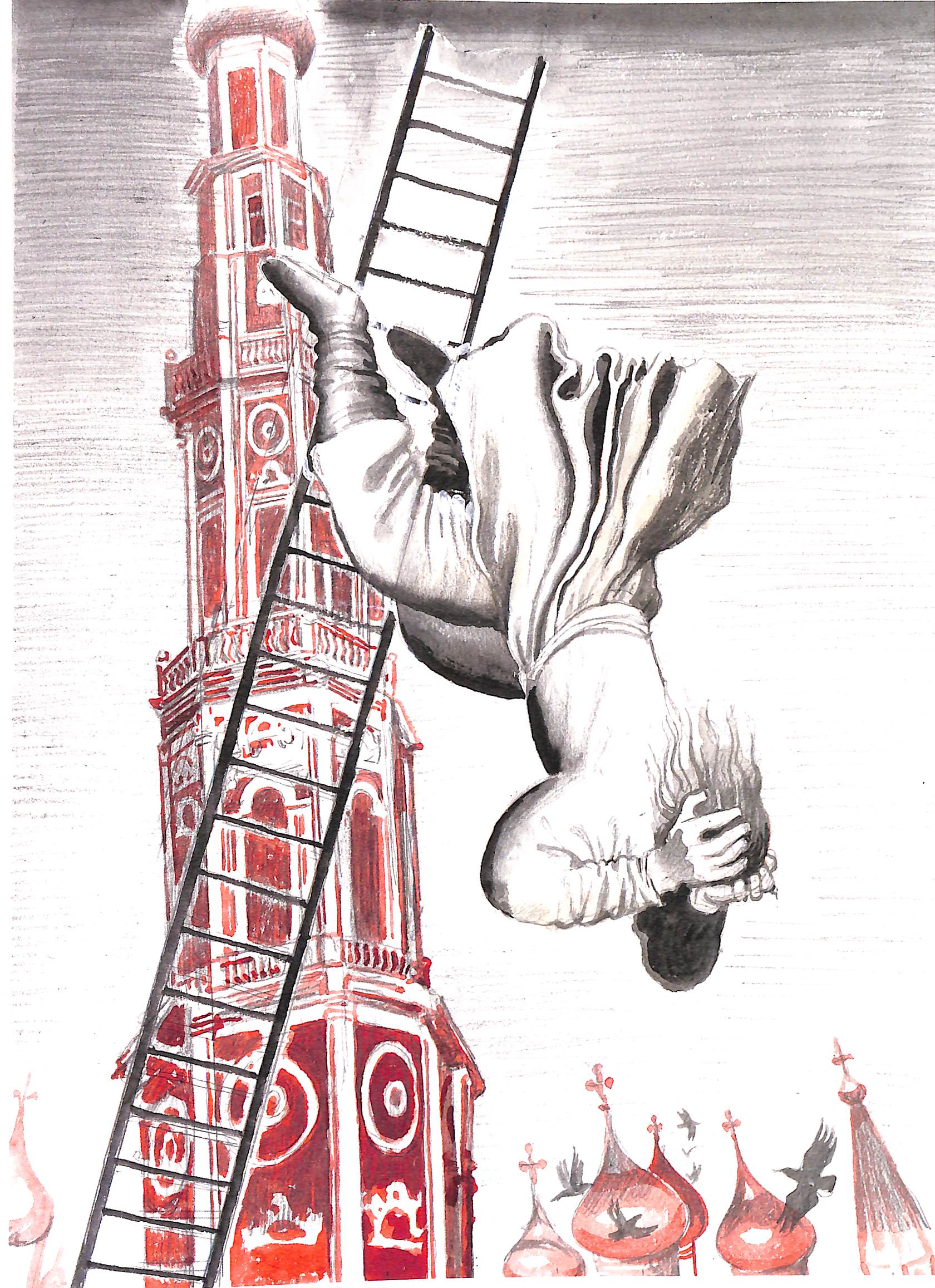 Пушкин завершает пьесу триумфом Самозванца. Но в первой сцене его появления (в келье у Пимена) Самозванец рассказывает сон, в котором он летит вниз с колокольни — то, что в действительности и ждёт его (простецкий приём Пушкина). Вот это фрагмент Слепков не упускает — с удовольствием рисует конец Самозванца.