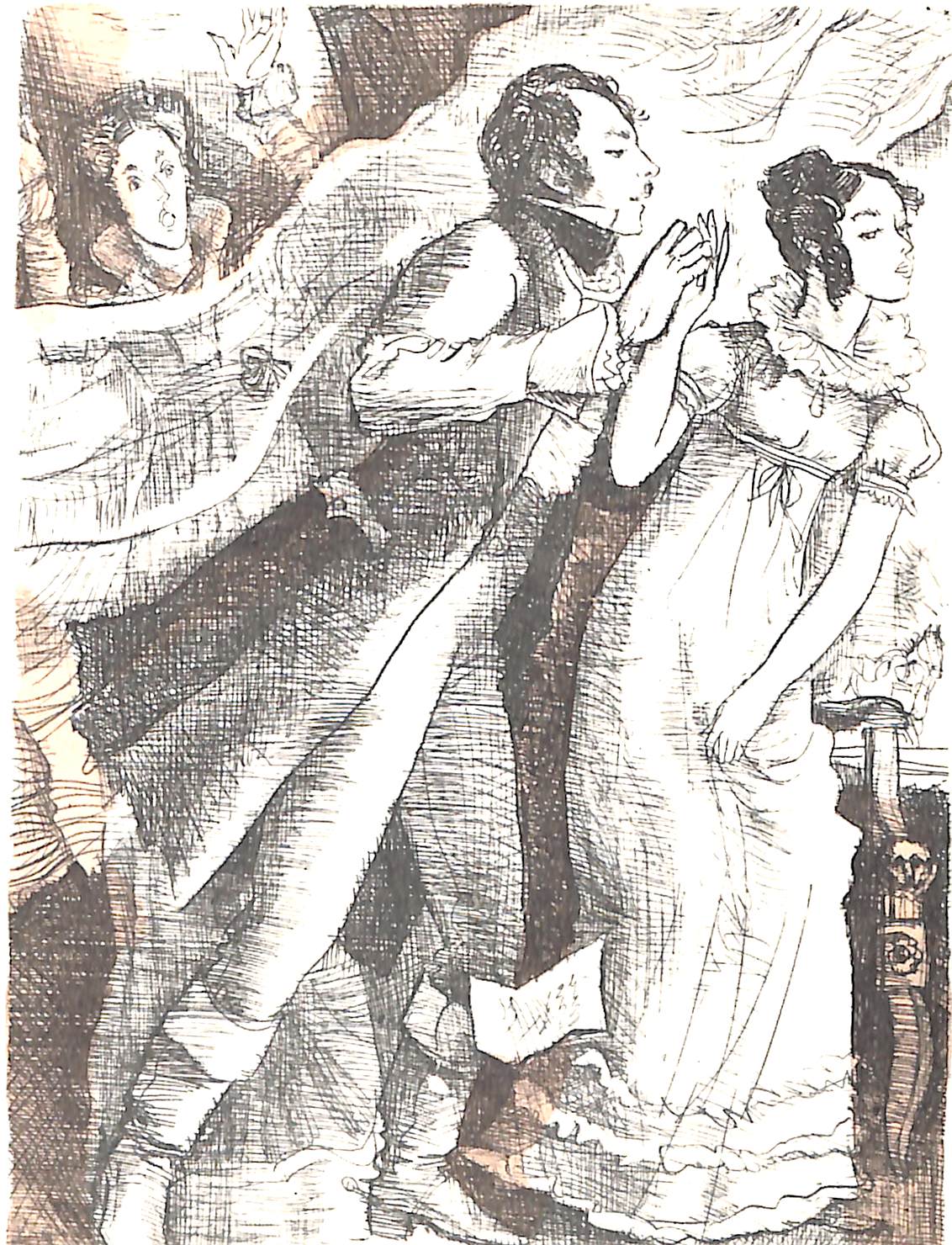 Художник Бунин бесподобен в своей экспрессии. Эта экспрессия проявляется даже в камерных сценах благодаря стремительному штриху рисунка. Любит Бунин женские образы из литературы XIX века. Героини у него гордые и страстные. Хотя без подписи не отличишь помещицу Лизу из "Барышни-крестьянки" от Маши из "Метели" и даже от Дуни из "Станционного смотрителя".