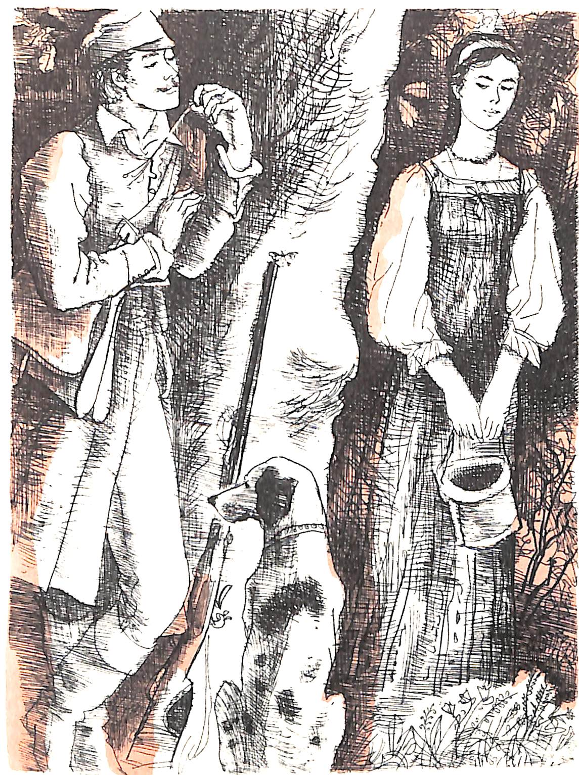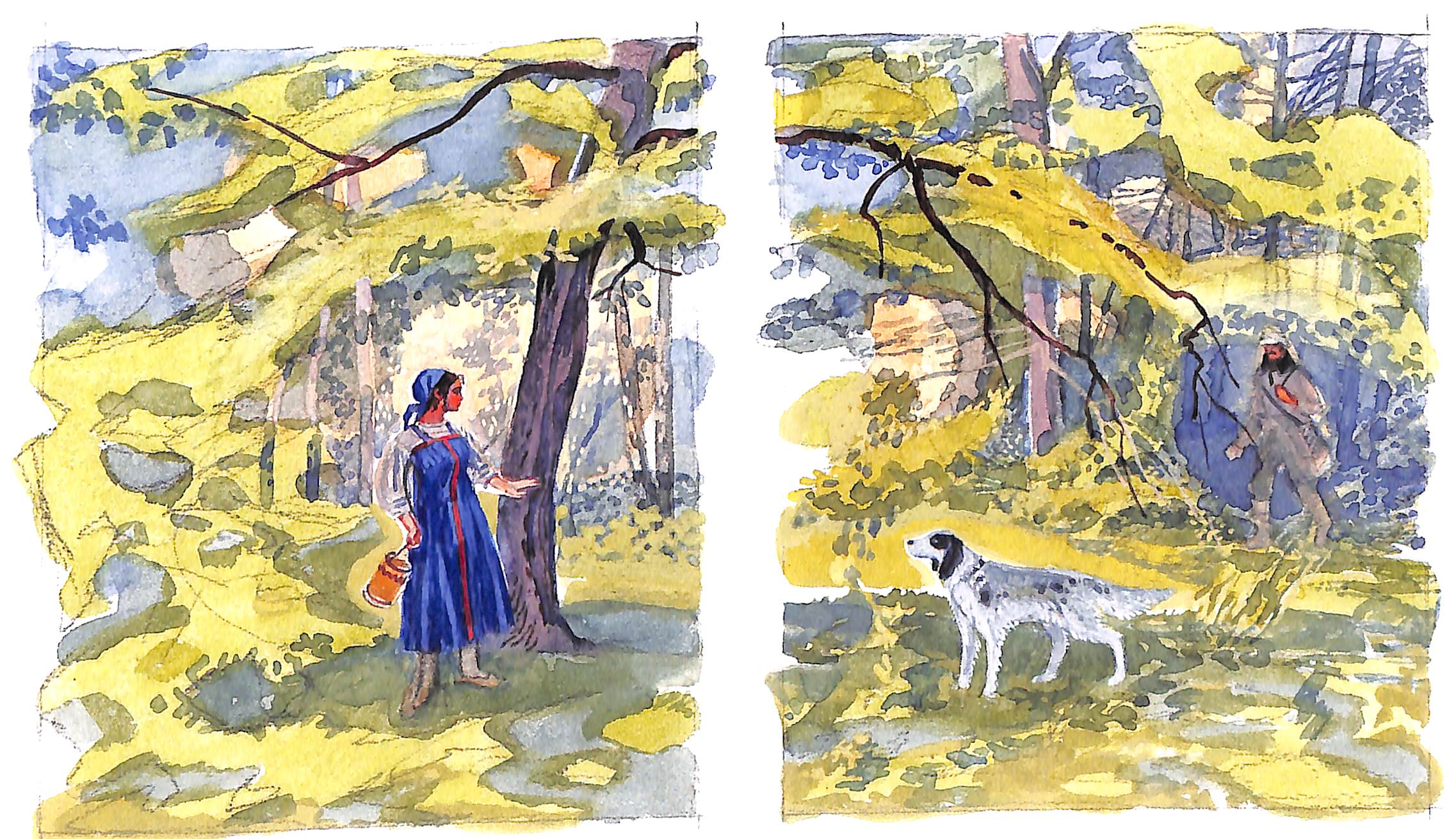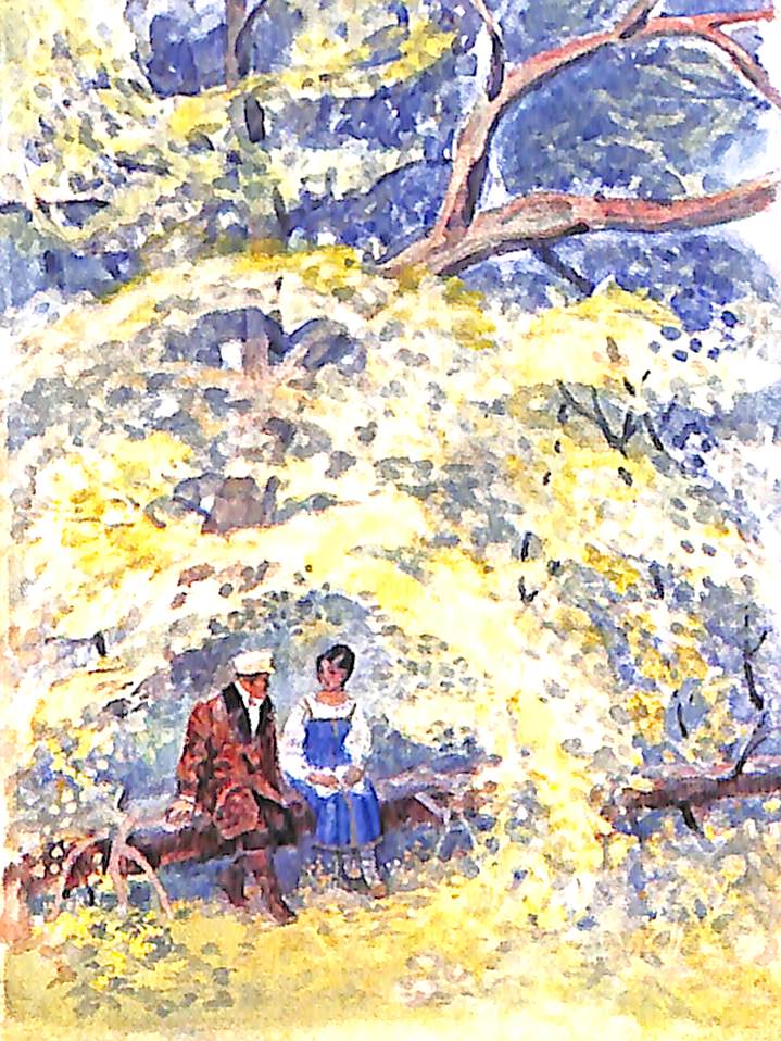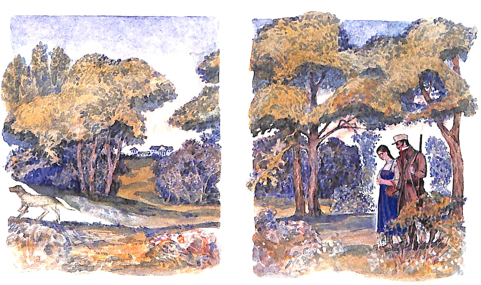 Здесь по две иллюстрации к каждой повести. По технике и композиции картинки совсем простые.