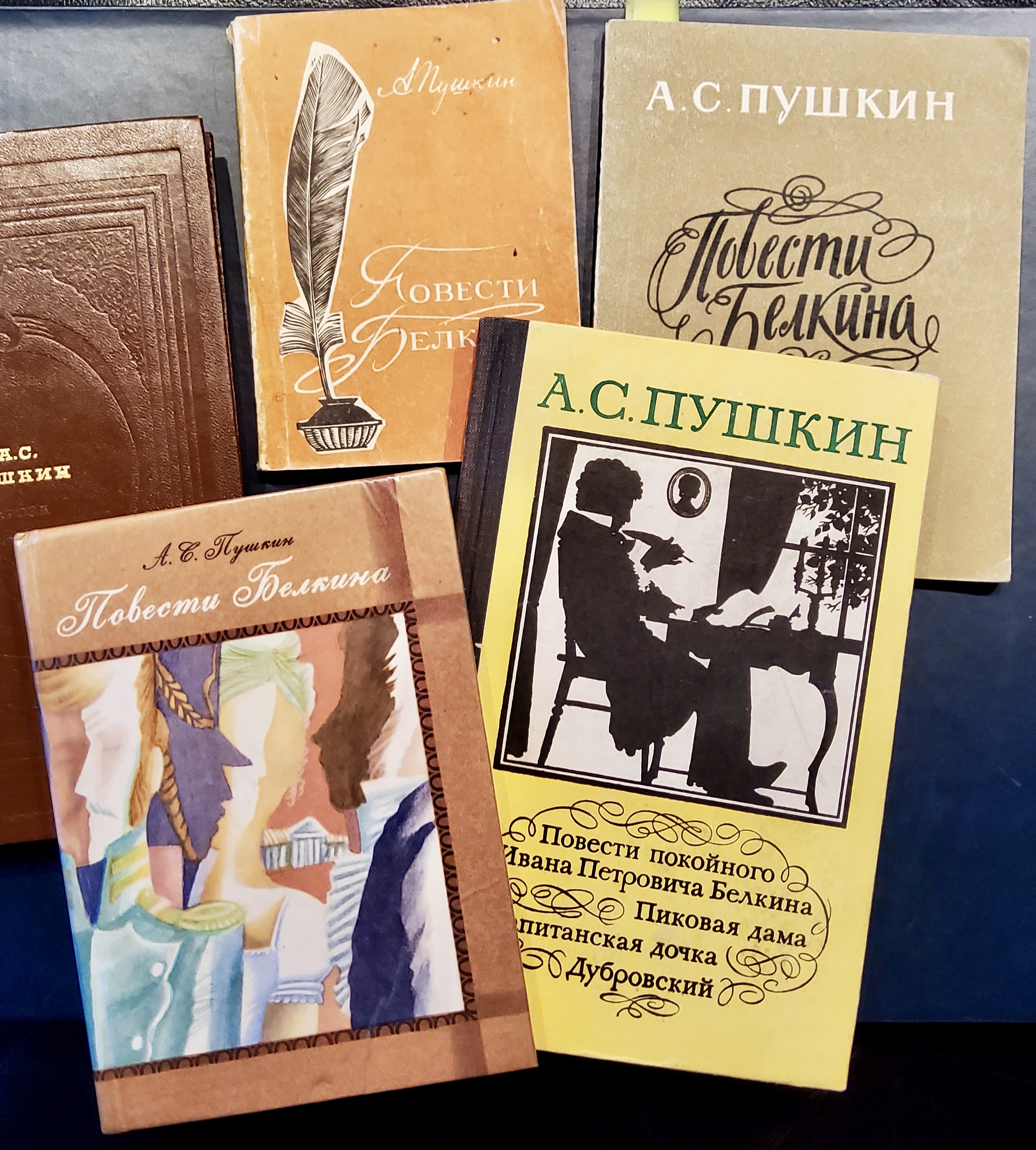 В верхнем ряду слева направо: "Повести Белкина", худ. В.Туманов (Барнаул: Алтайское книжное издательство, 1968); "Повести Белкина", худ. Г.Коновалов (Куйбышев: Куйбышевское книжное издательство, 1973).
