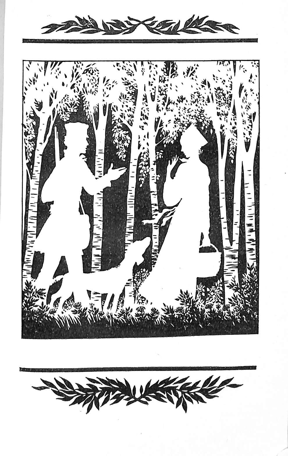 По две иллюстрации к каждой повести в технике силуэта.
