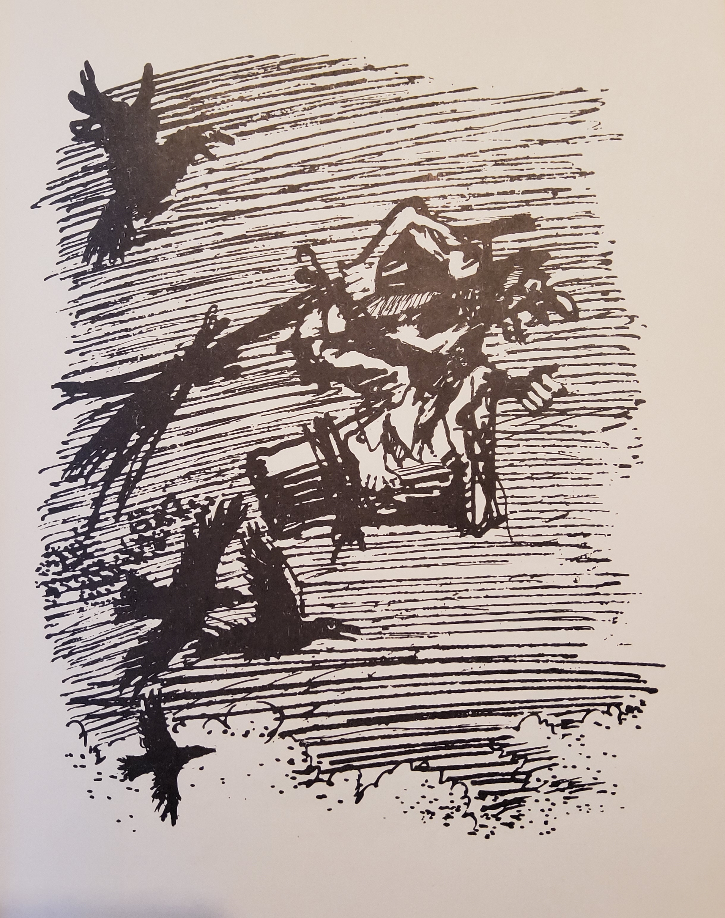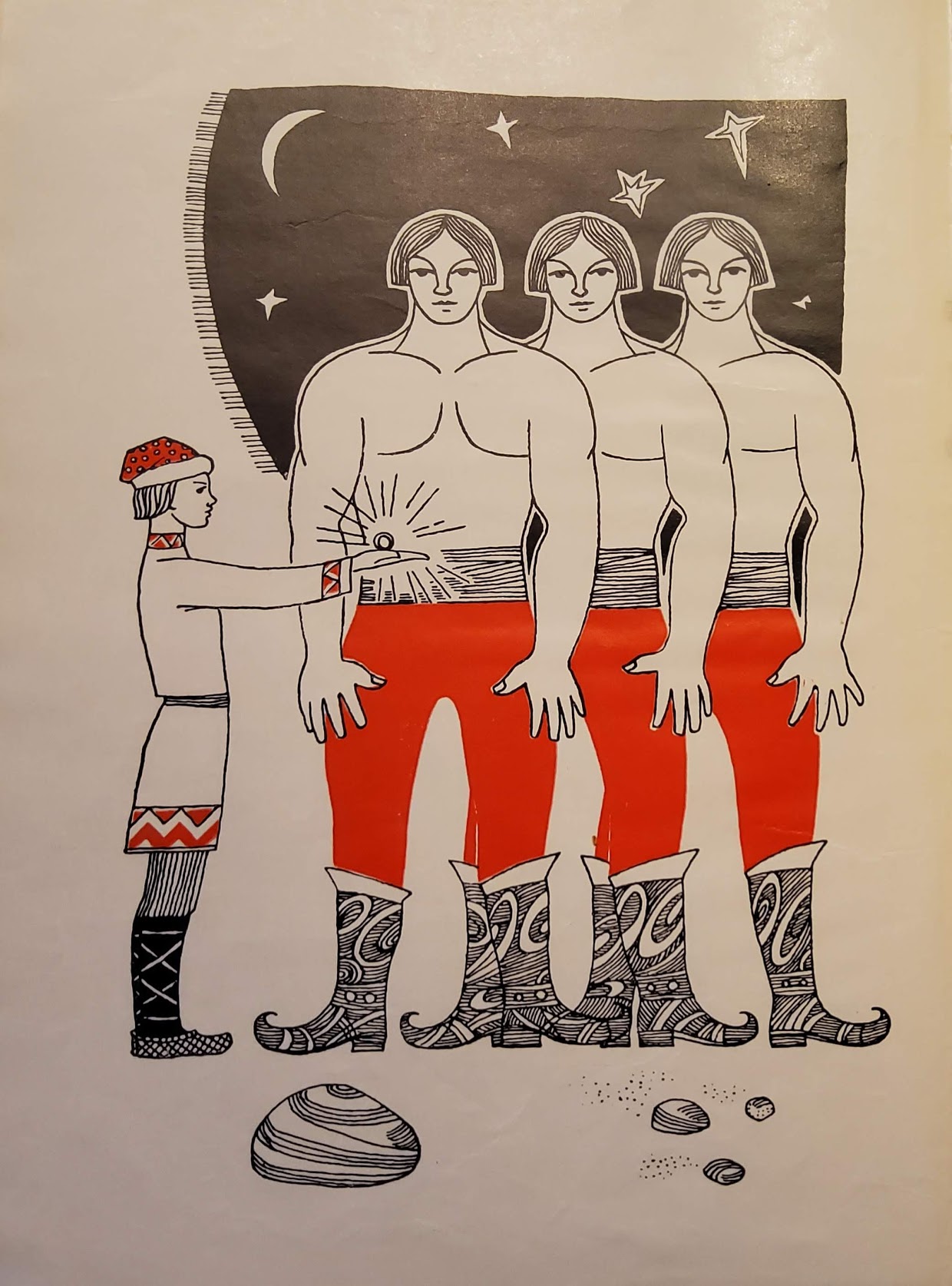 К каждой сказке — только по одной чёрно-белой заставке. Но всё-таки это незаурядный Мосин. Плотные формы, переплетающиеся друг с другом. Г.Калиновский в те же годы для столичных издательств так же разрисовывал листы карандашом, не оставляя ни одного клочка пустого. Жёсткие требования к массовым эконом-изданиям — это, наверное, была хорошая школа.