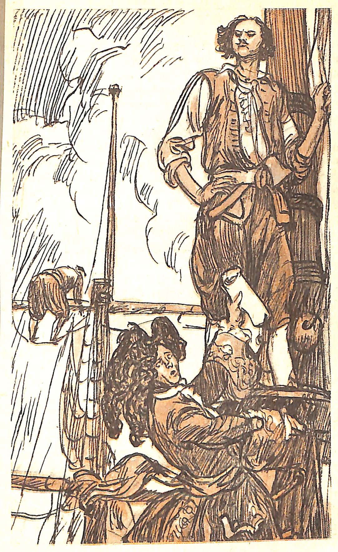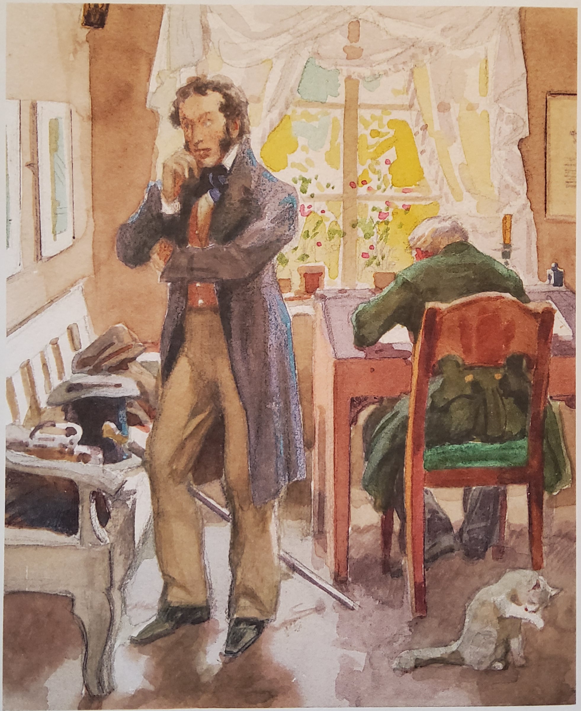 4) На контрасте с ответственным Ибрагимом есть у Пушкина другой персонаж: шалопай Корсаков, который тоже вернулся из-за границы, но знаний не привёз, только модные наряды. Нетрудно угадать его судьбу. Встречи Корсакова с Петром не остались без внимания художников.