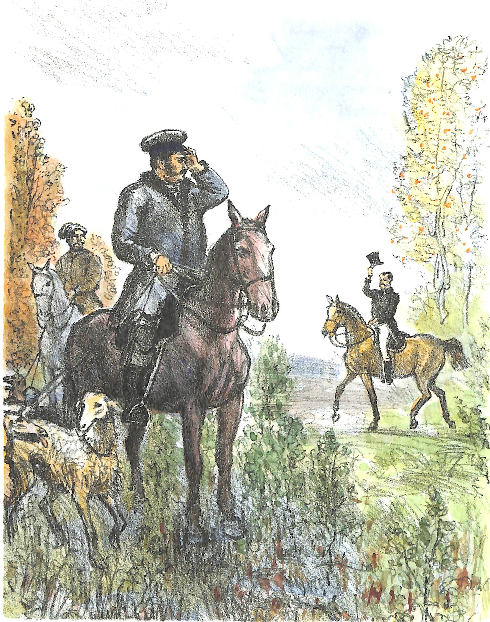 Оставалось 28 верст до Петербурга. Пока закладывали лошадей, Ибрагим вошел в ямскую избу. В углу человек высокого росту, в зеленом кафтане, с глиняною трубкою во рту, облокотясь на стол, читал гамбургские газеты. Услышав, что кто-то вошел, он поднял голову. „Ба! Ибрагим?“ закричал он, вставая с лавки: „Здорово, крестник!“ Ибрагим, узнав Петра, в радости к нему было бросился, но почтительно остановился. Государь приближился, обнял его и поцаловал в голову. „Я был предуведомлен о твоем приезде“, сказал Петр — „и поехал тебе навстречу. — Жду тебя здесь со вчерашнего дня“.