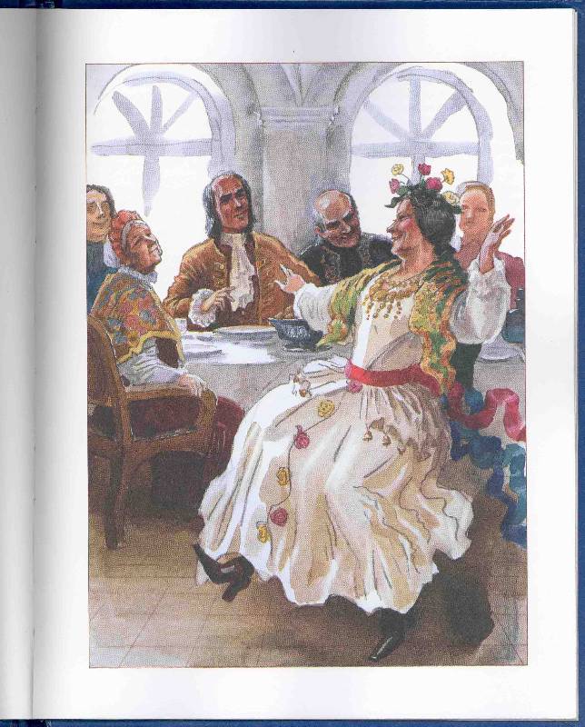 б) Карлица-шутиха у старой знати: критика новых порядков на обеде у вельможи Ржевского.