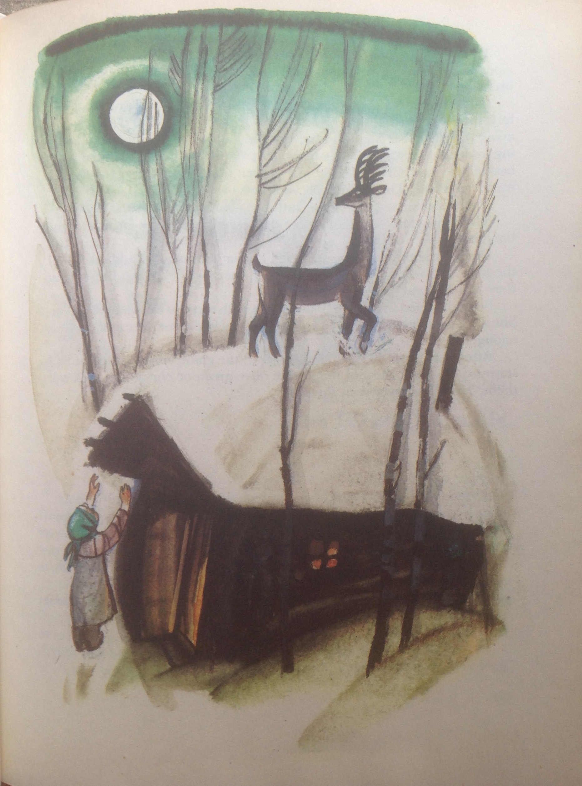 У Бажова большой промежуток между вечерними рассказами о козлике и отправкой наших героев в лес. Емельянова этот промежуток заполнила. И не прогадала — показала себя настоящей художницей. Как ветерок листья золотой осени в избу завевает! Очень важно показывать такие возможности живописи в детской иллюстрации: дети очень внимательно рассматривают картинки (и немало тех, кто захочет понять: как же это сделано?).