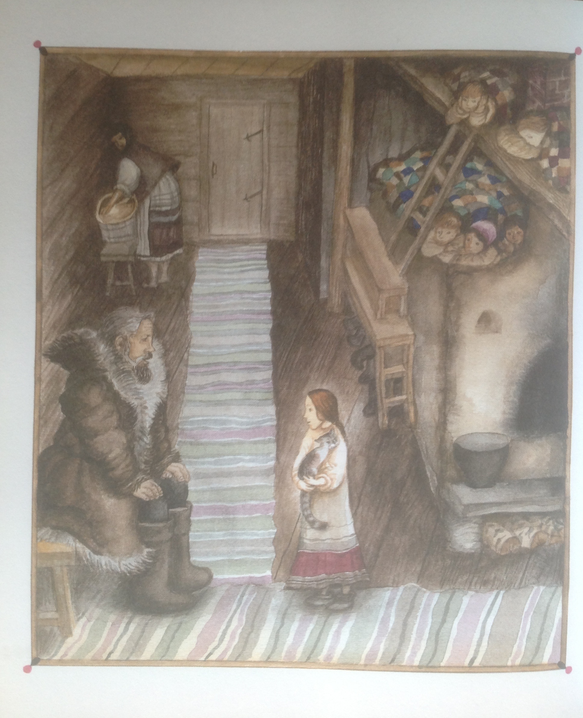 Вот с самого начала: четыре иллюстрации про то, как Кокованя Дарёнку из чужой семьи забирает. При том, что картинки симпатичные — на природу можно полюбоваться, да и многие художники этому начальному эпизоду три иллюстрации посвящали. Но здесь А.Плаксину трёх было мало, требовалось для того, чтобы место занять ещё хотя бы одну картинку втиснуть. И вот он рисует Дарёнку с кошкой перед окном, а на улице на подоконнике — воробьи. Как это понимать? Повествование этой картинкой явно разорвано.