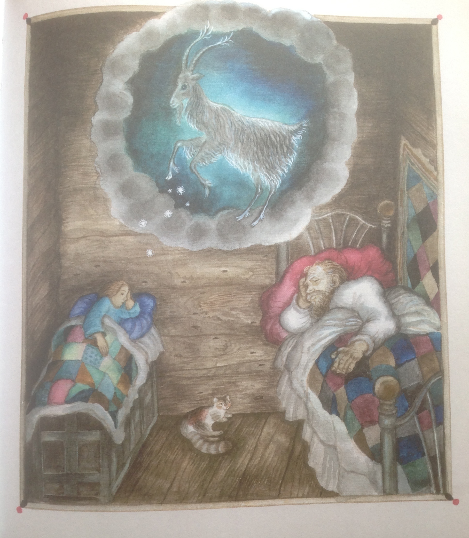 У Ионайтис — привычная сцена: Дарёнка открывает дверь балагана и высматривает козлика. У Емельяновой — совмещение сна и яви, когда Дарёнка ещё сомневалась, может приснился ей козлик. Козлик присутствует в облачке дрёмы.
