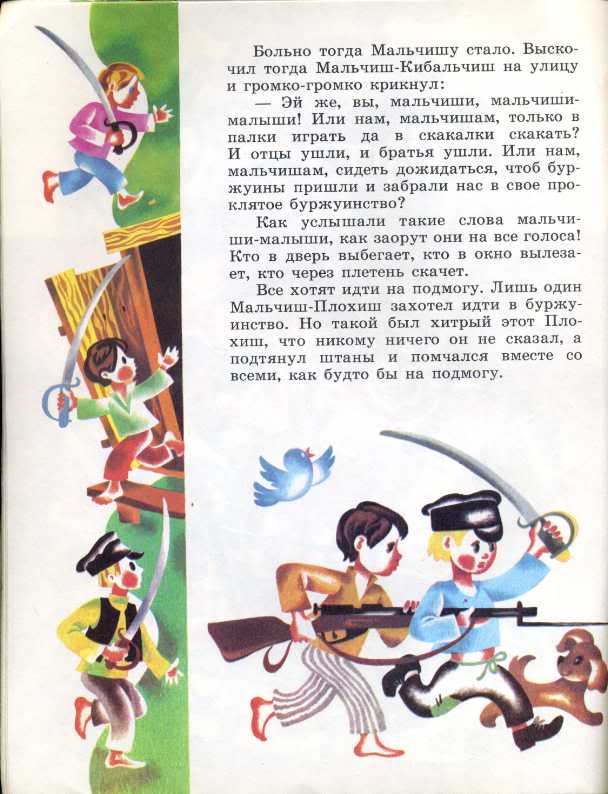 Мальчиша-Кибальчиша в виде пупсика в днепропетровском издании 1984 года (см.) можно было бы объяснить случайным стечением обстоятельств, но, возможно, существовала общая тенденция снижения накала революционной романтики в поздне-советском обществе. Что-то случилось в начале Семидесятых: для взрослых ещё десять лет барды воспевали остервенение Гражданской войны, в фильмах показывали очеловеченных белогвардейцев. А для детей — снова возврат к окарикатуренным лузерам-проигравшим, например, в фильме "Корона Российской империи".
