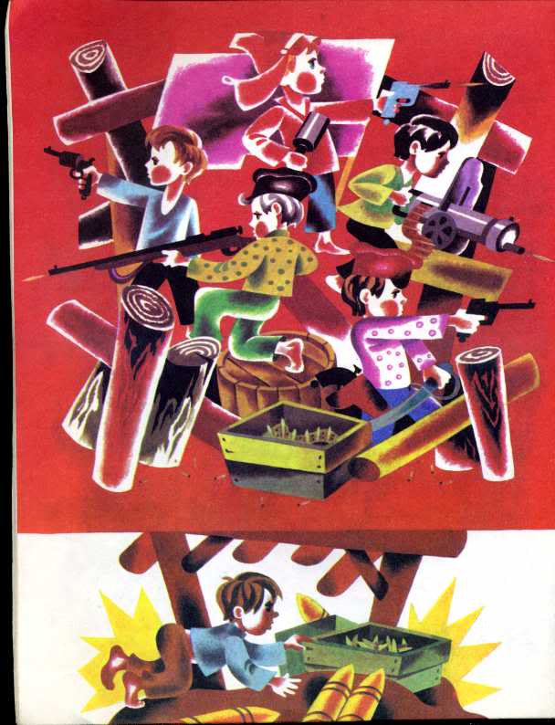 2) В февральском номере 1987 года художник Н.Устинов погружается в историческую атмосферу: опять клапаны на шинели, маузер на бедре... Но и одежда женщины и ребёнка соответствует этой военной форме 1920-х гг. Куда-то всё же совершила Красная Армия победный шестимесячный поход в альтернативном 1925-м году... Ох, уж эти затаившиеся троцкисты-художники.