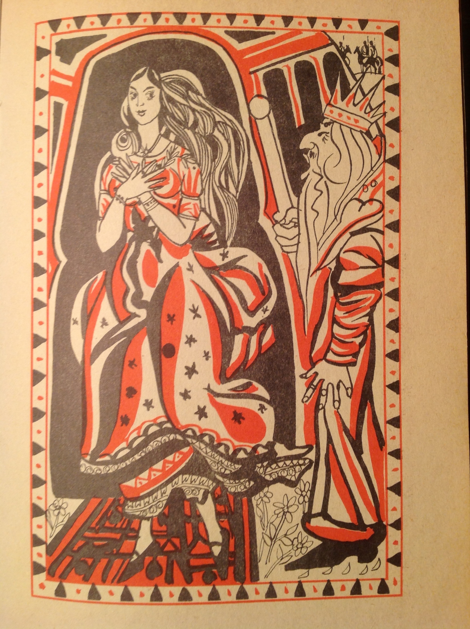 Вот все картинки из издания 1961 года. Видно, что Брюханов — классный рисовальщик. Сцены для иллюстрирования выбраны далёкие от ключевых точек сюжета — это, скорее, просто передача настроения. Видимо, художник не хотел повторяться, да и начало шестидесятых обязывало к экстравагантности. Но концепция концовки действительна сильная: любопытствующие, но не испуганные воины над телом царя.