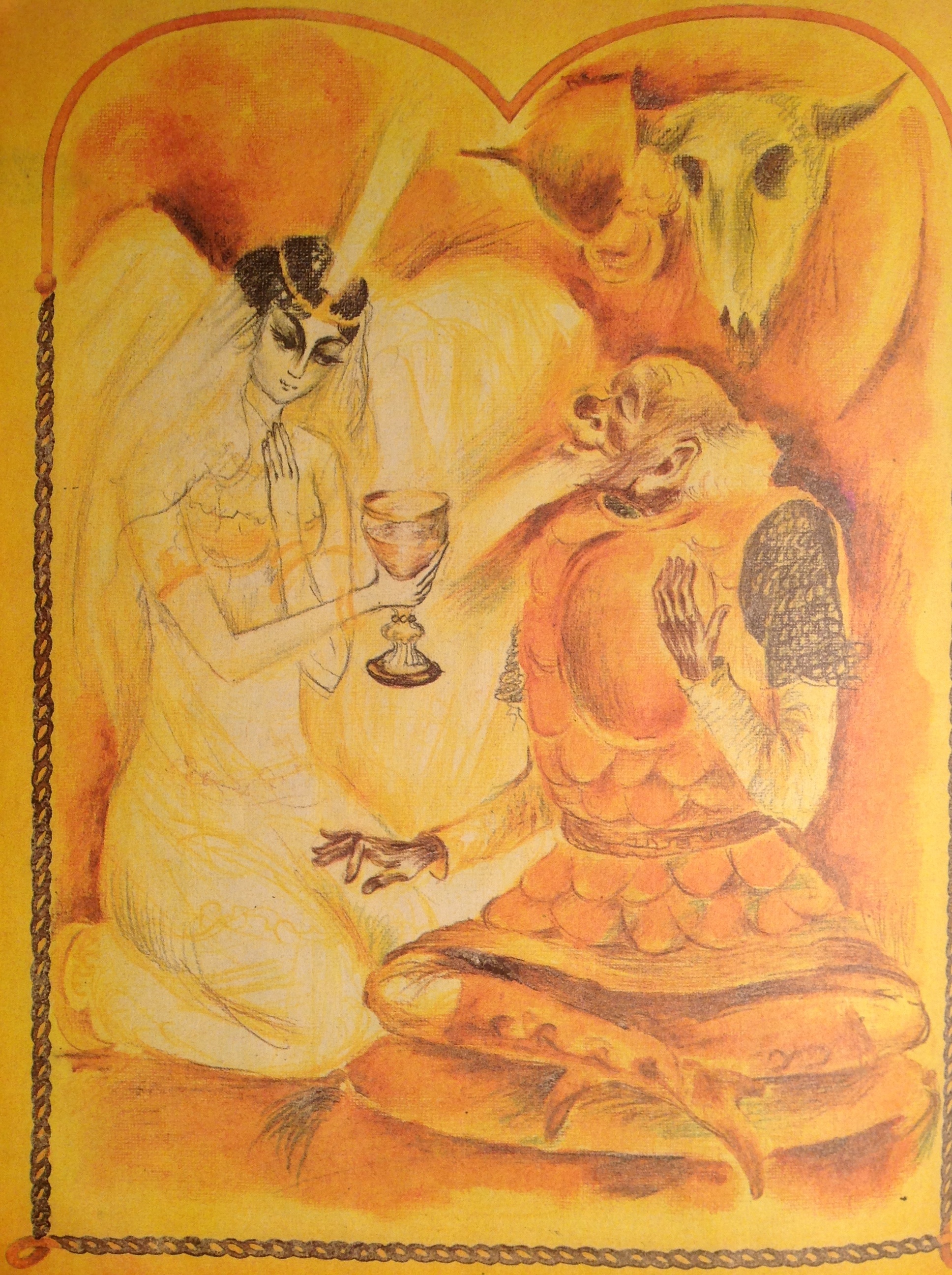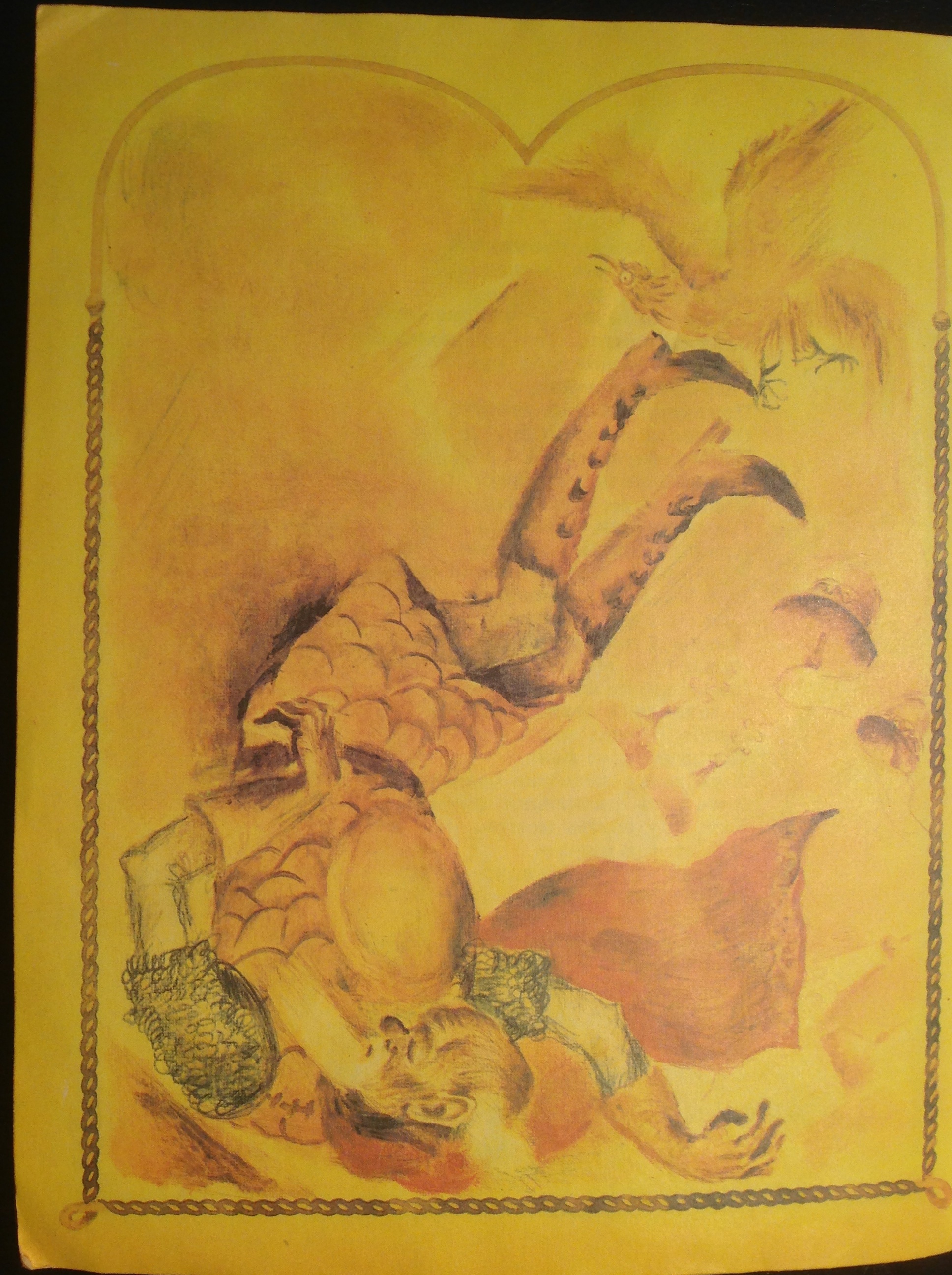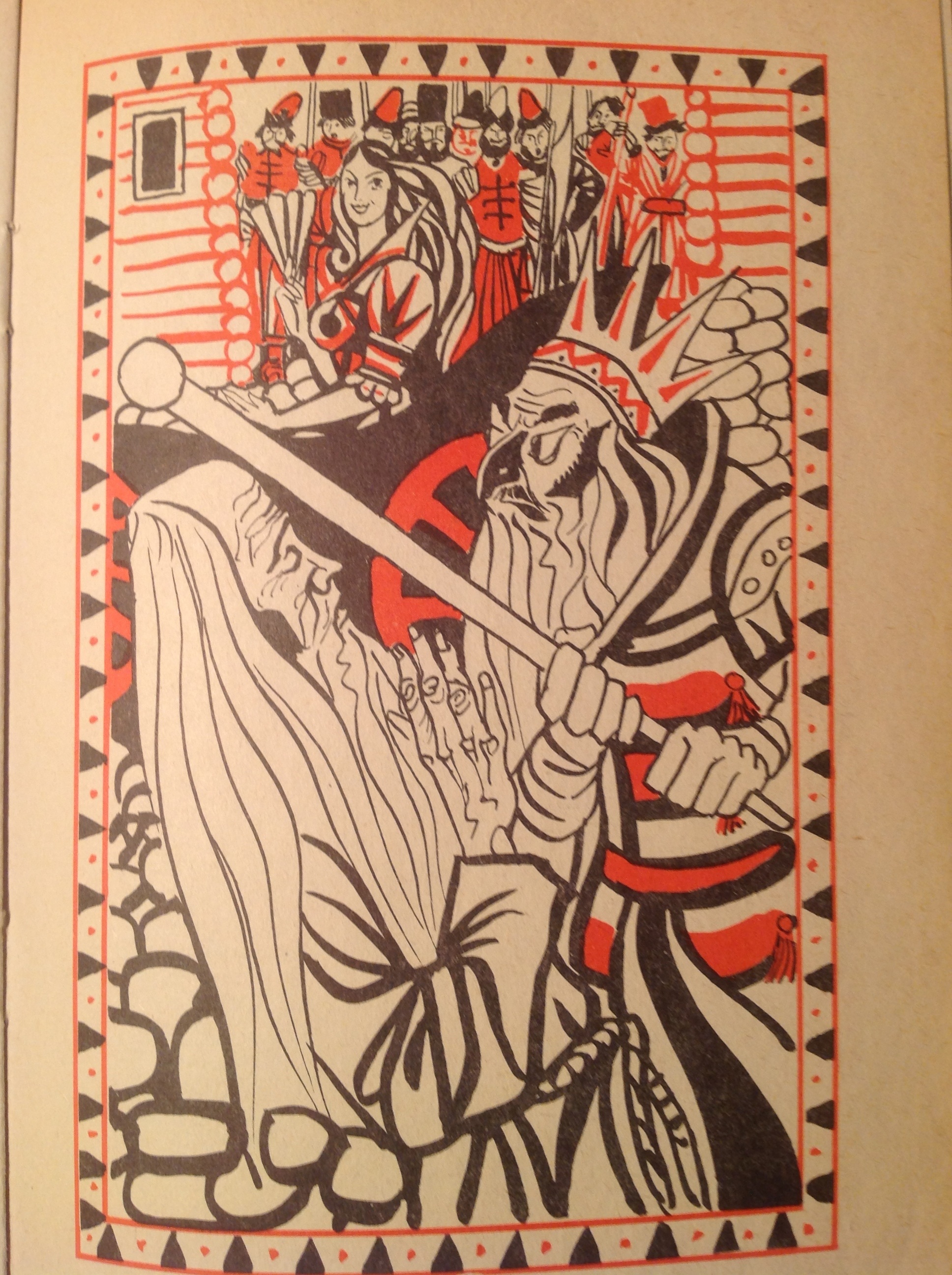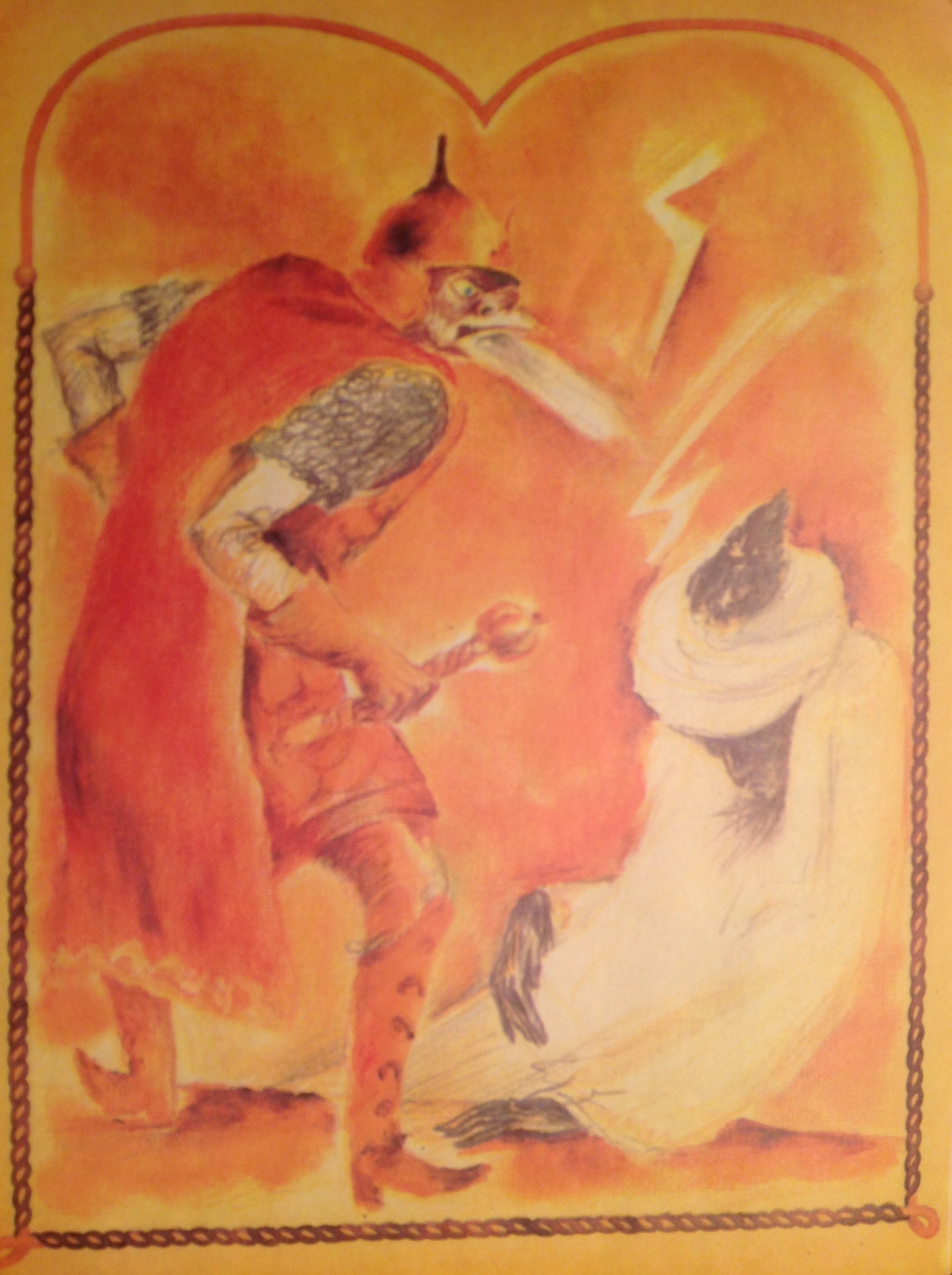 4) Мудрец хотел вырвать соплеменницу из грязных лап иноверца. Царь его убил. В этой сцене курносый царь изображён гориллой — так же, как во время войны Кукрыниксы рисовали фашистских оккупантов. Может, наш художник поднаторел в политической карикатуре и автоматически перенёс своих персонажей в детскую сказочку?