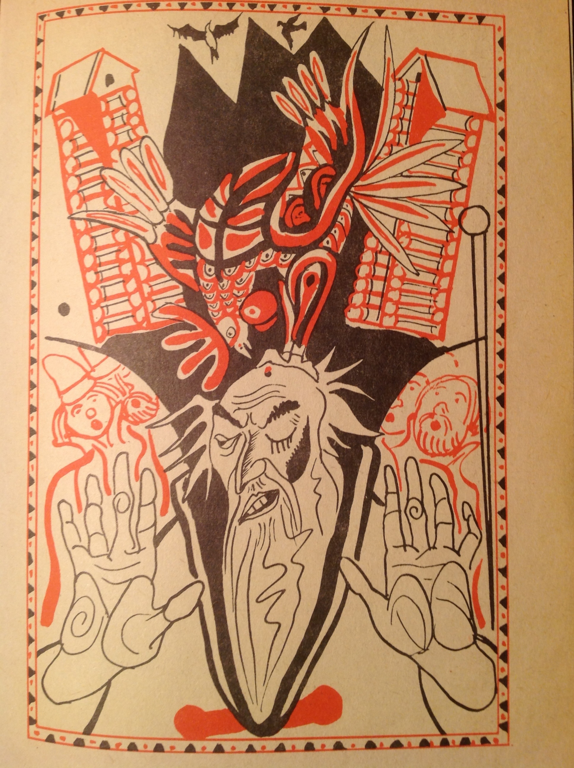 У художника собственный почерк. Есть концепция. Сказка трактуется как мрачная история. Царь — злобный кащей. Иллюстрация вверху первой страницы с текстом — это как бы эпиграф ко всему произведению — мрачна и беспросветна (к "Слову о полке Игореве" такие рисуют). У Билибина концепция схожая, но там яркость красок вносила элемент праздника. А тут — два цвета и и аскетичный рисунок.
