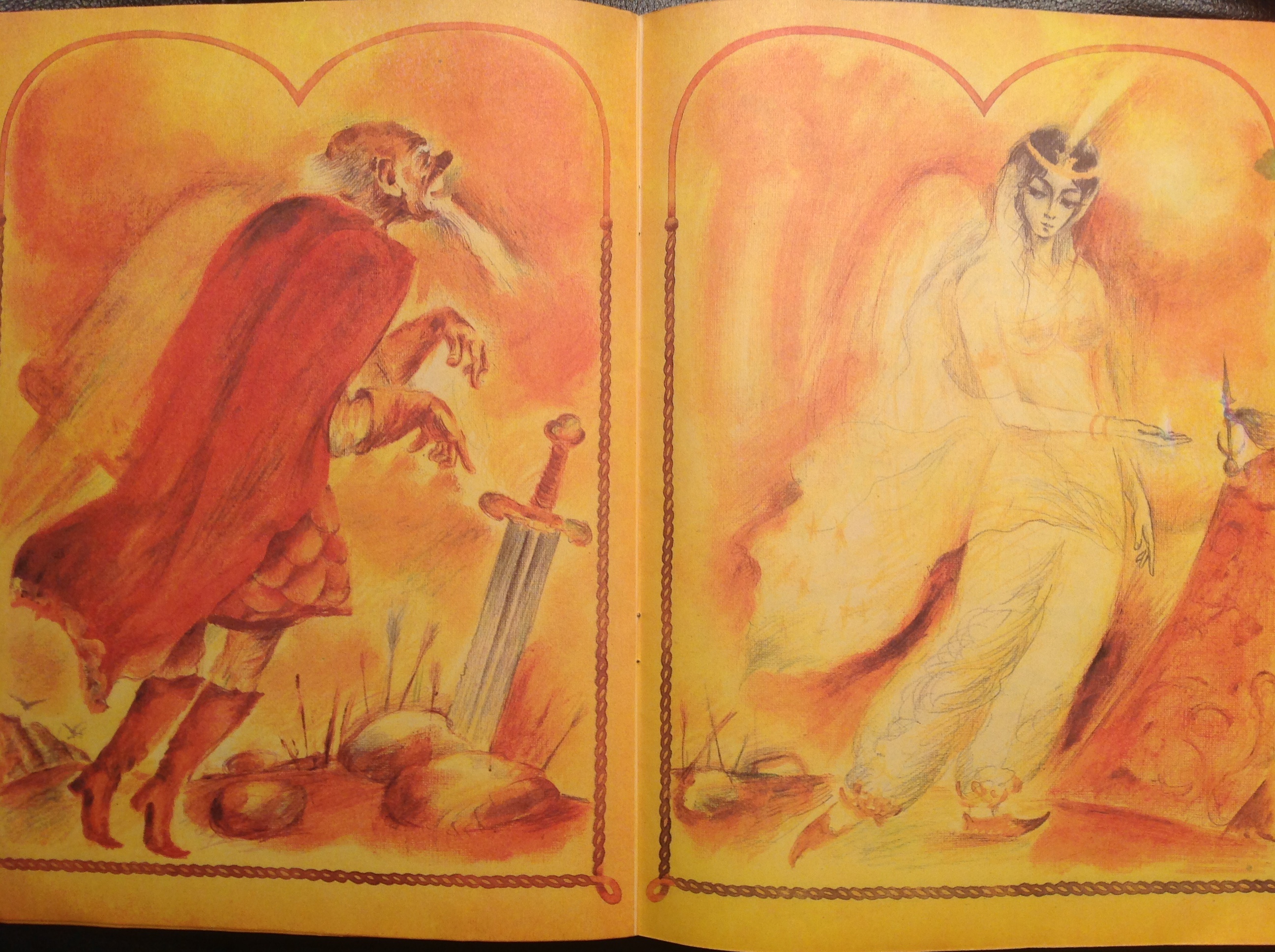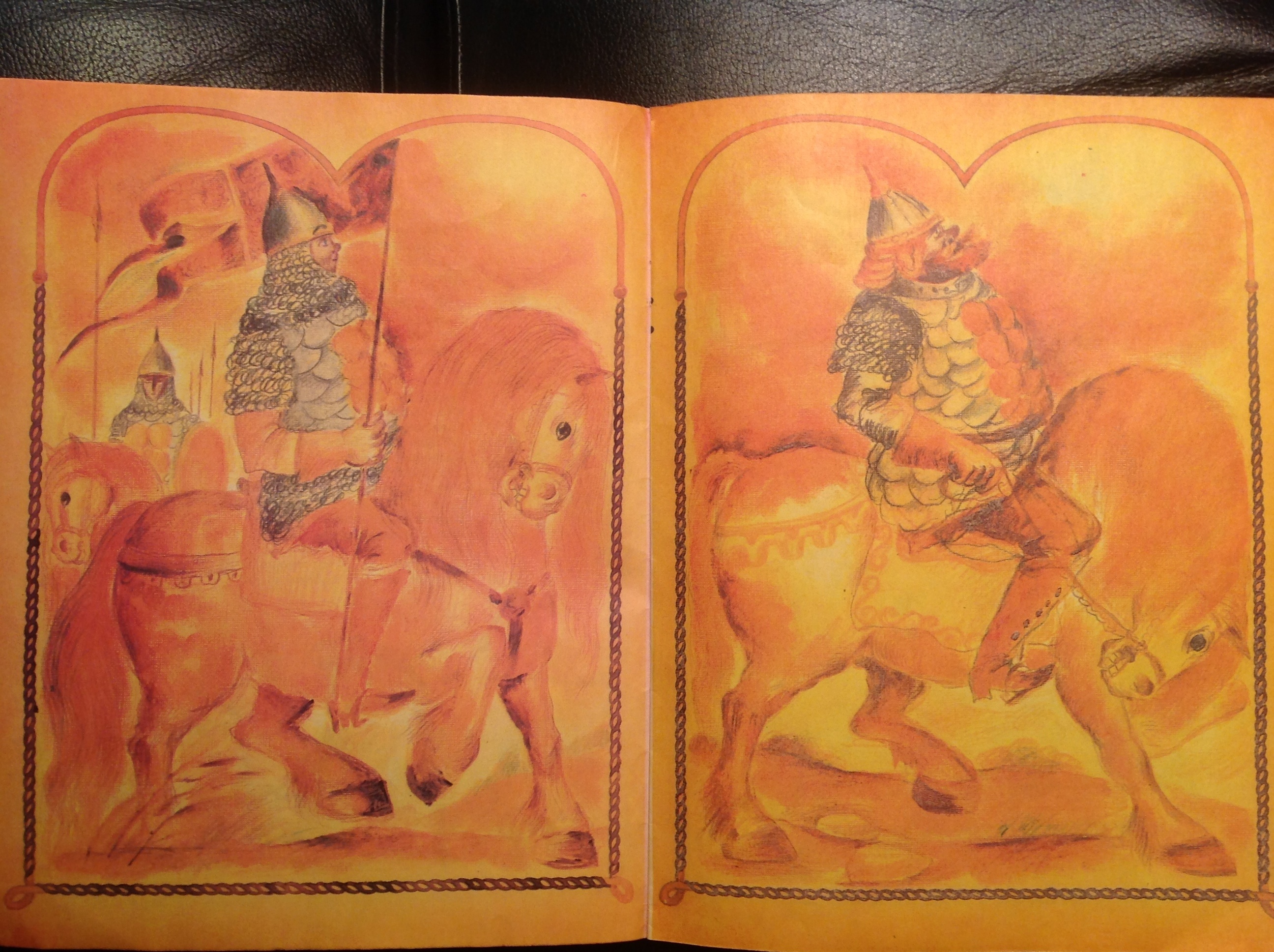 Сегодняшняя книжка-картинка была издана в Узбекистане в 1989 году. Это политкорректный "Золотой петушок" — такой Пушкин должен был понравиться местному населению. Царь и его солдаты — курносые. Царь — злобный пигмей. А вот восточные персонажи очень привлекательны — мудрость и красота.