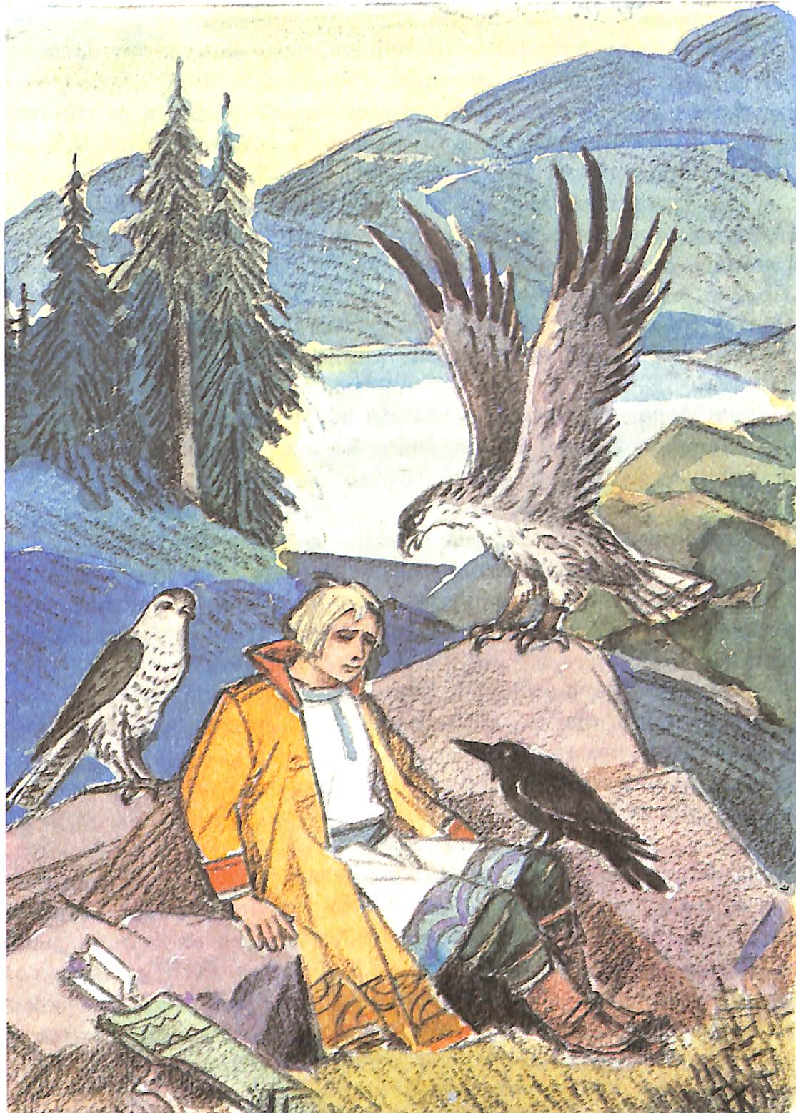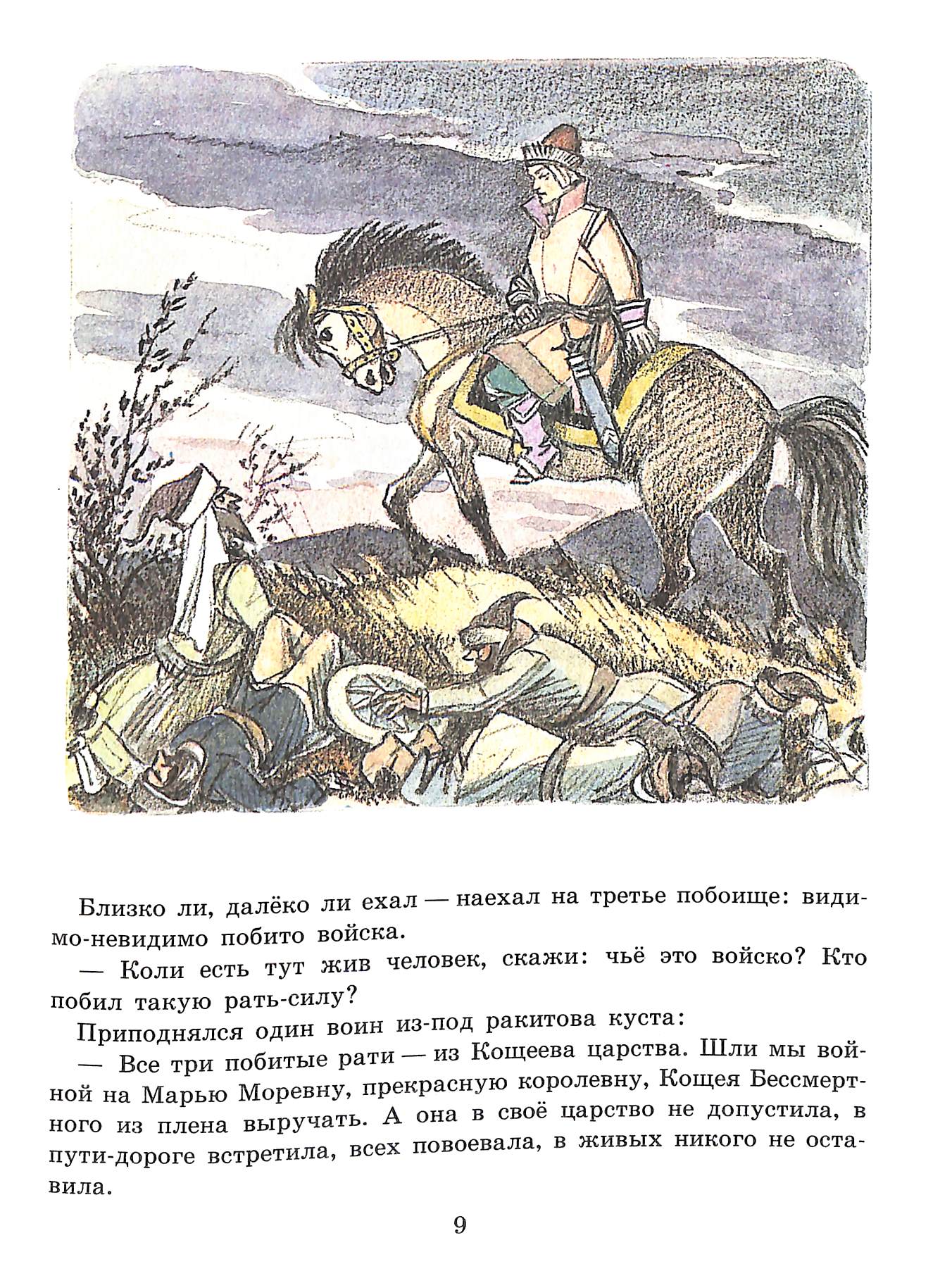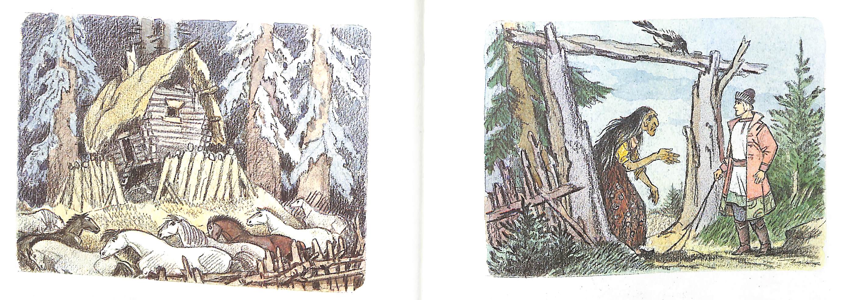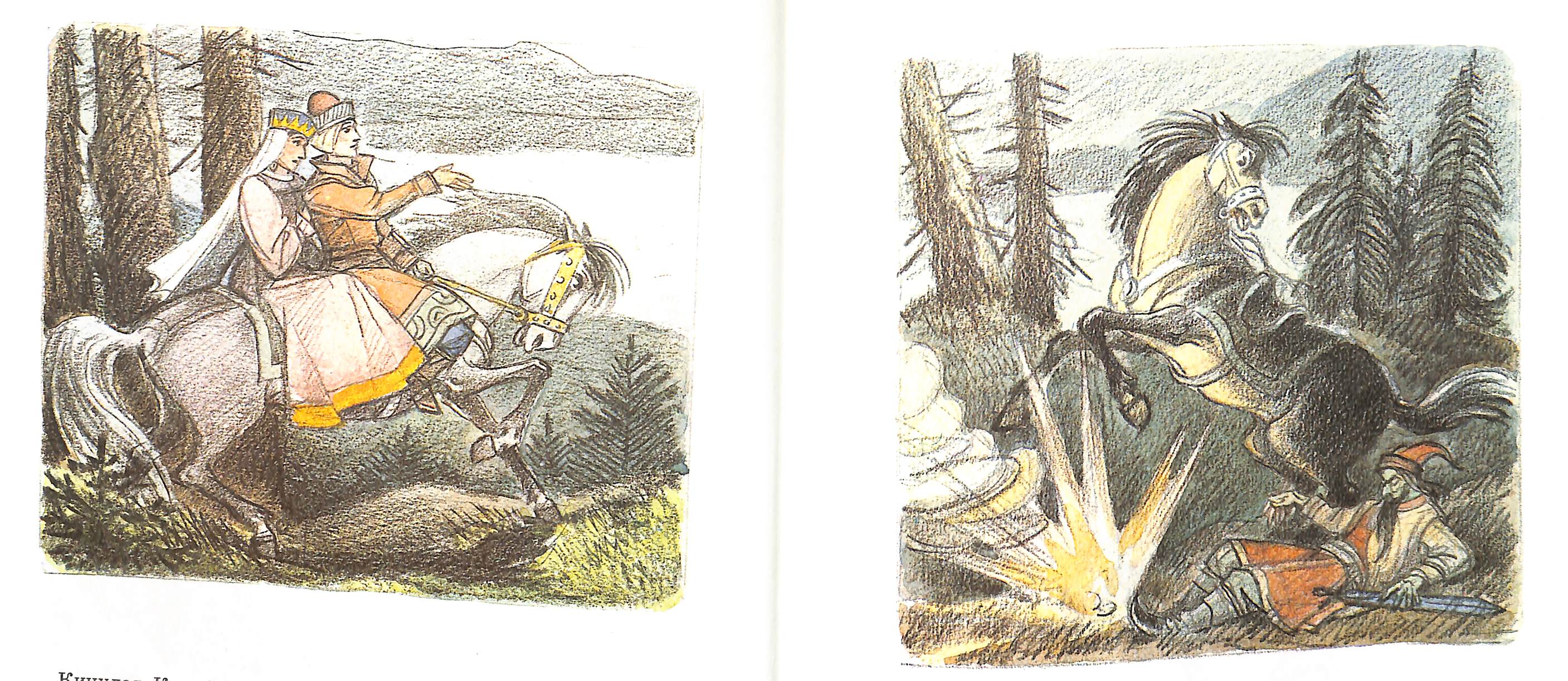 Ещё раз Кощей у художника мелькнёт издали (если не считать фигурки на обложке). И опять на первом месте мрачный пейзаж: художник рисует, что умеет. И пейзаж — единственное сказочное в этой книжке.