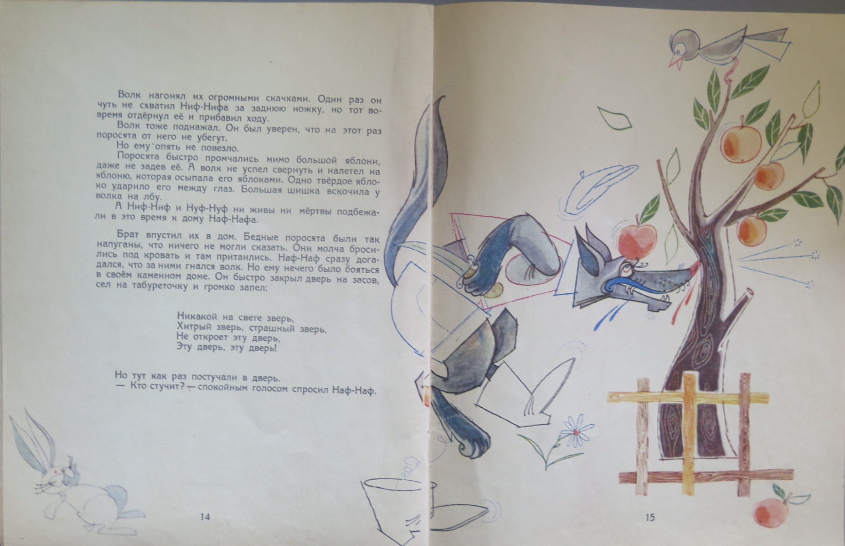 4) А вот и отличия. Степанцев в 1965 году наделяет третьего поросёнка гармошкой — по сравнению с барабаном и горном весьма продвинутый уровень. Савченко в 1978 году, как мы знаем, начиная с обложки, тоже подчеркнул музыкальное мастерство Наф-Нафа, но наделил его гитарой — инструментом бардов.