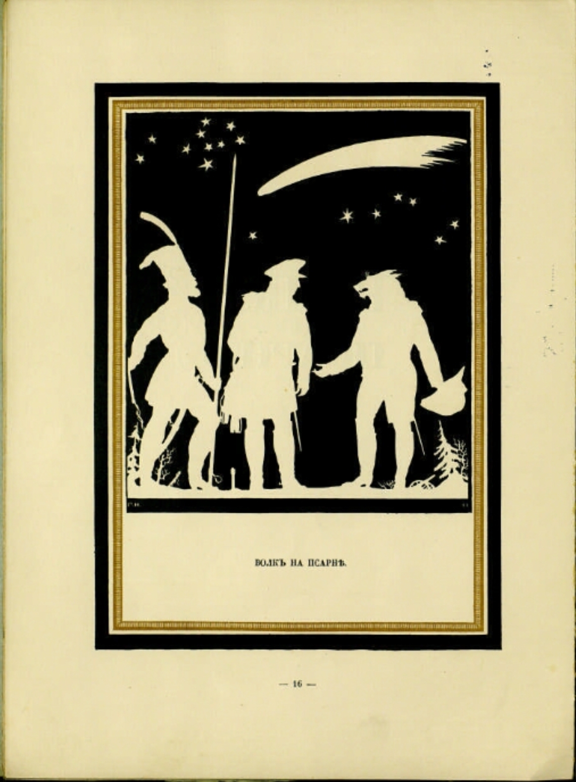 Есть страничная иллюстрация к басне. В небе — комета, грозящая гибелью всей земле. Но Нарбут необычно решает главную интригу. Волк ворвался в мирное хозяйство, он забился в угол, сейчас его собаки разорвут на части... Даже дедушка Крылов жаждет крови. А Нарбут через сто лет рисует подчёркнуто спокойную сцену: Волк в мундире на равных ведёт переговоры с русскими военными (в басне ведь с волком тоже не собаки беседует, а люди).