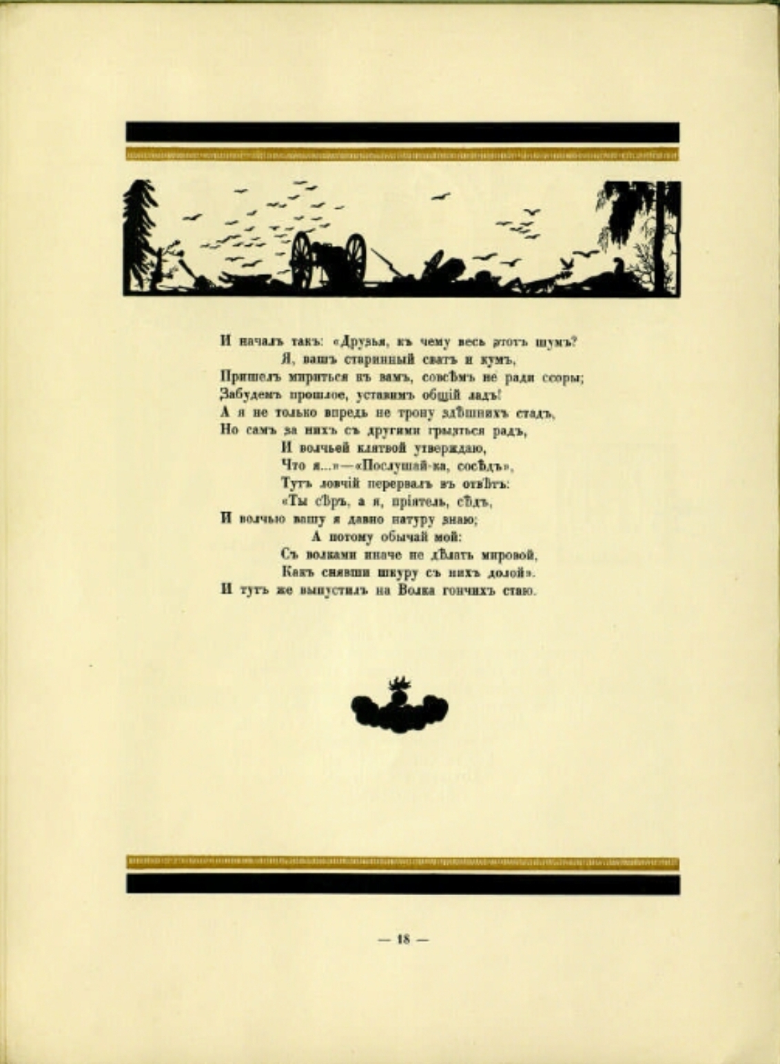 Иллюстрации Нарбута к столетней годовщине Отечественной войны. Иллюстрации из сборника "Спасенная Россия в баснях Крылова". В этой книжке не силуэты, а рисунки, стилизованные под гравюру по меди: какими были все рисунки в книгах столетней давности.